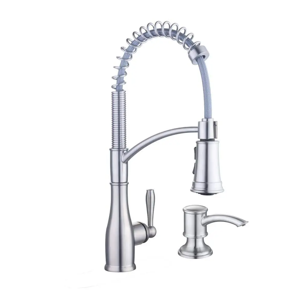 The Glacier Bay Mandouri Spring Neck Pull-Down Sprayer Kitchen Faucet with TurboSpray, FastMount, and Soap Dispenser in Stainless Steel is the perfect way to modernize your kitchen. With its commercial-style design and open-coil spout, it adds an industrial touch to complement contemporary kitchen décor. The faucet features a single-handle design with a sleek stainless steel finish. It includes a pull-down spray wand with two spray modes: aerated spray and TurboSpray, which provides a more powerful spray pattern for efficiently cleaning pots, pans, and dishes. The faucet also boasts a ceramic disc cartridge for drip-free performance and offers a 1.8 GPM flow rate for optimal water efficiency. Thanks to the exclusive FastMount mounting system, installation is quick and easy. Additionally, the faucet comes with a convenient soap dispenser for added functionality.