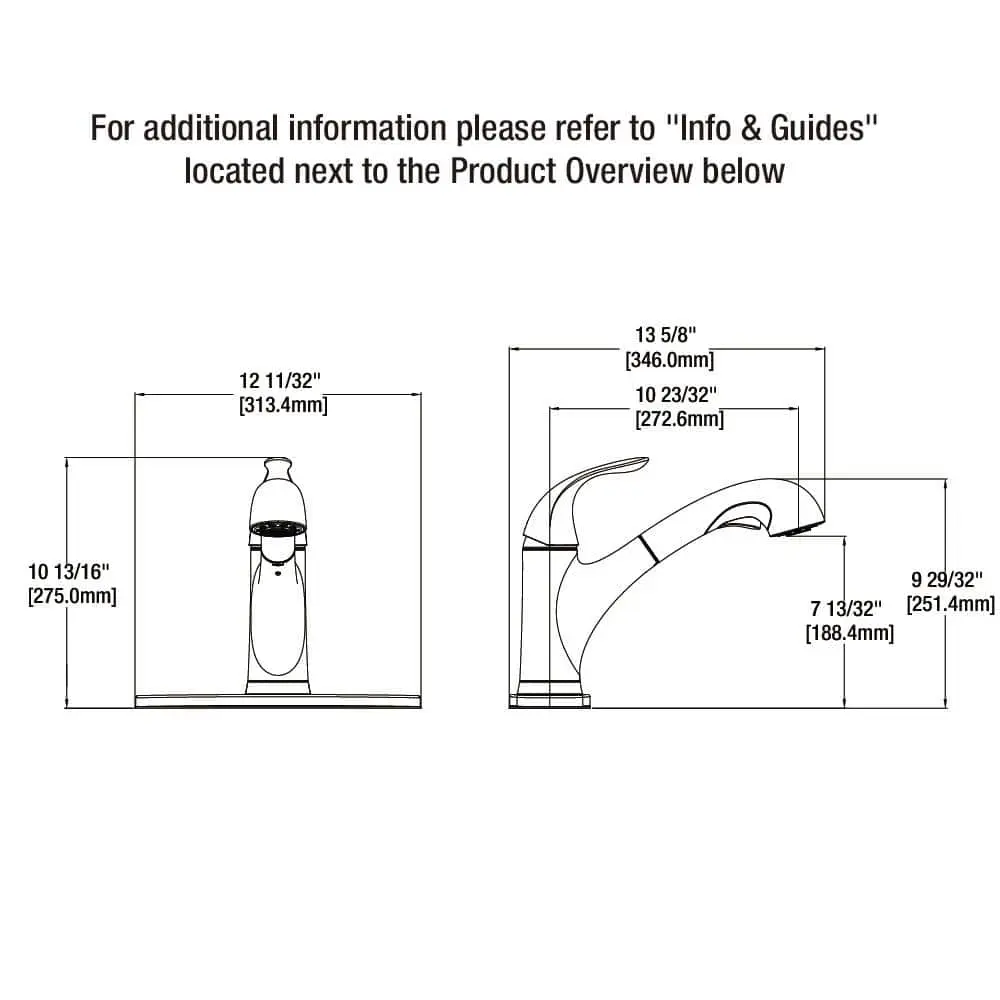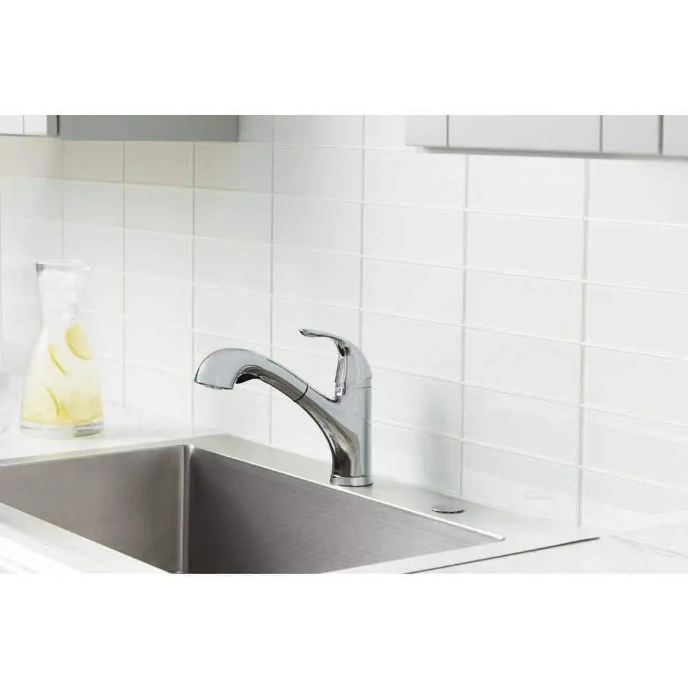 The Glacier Bay Market Pull-Out Kitchen Faucet in Chrome features durable metal construction for long-lasting use. Its ADA-compliant single lever handle makes adjusting water temperature and volume easy. The pull-out sprayer offers an aerated spray and the exclusive TurboSpray, delivering a stronger spray compared to standard pull-out faucets. The faucet includes a 29.5-inch braided supply hose with a 25.2-inch workable length for greater reach, perfect for large pots or sink cleaning. Additionally, the FastMount system simplifies installation for quicker setup.