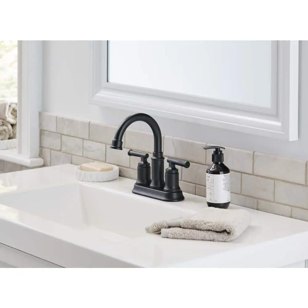 The Oswell 4 in. Centerset 2-Handle High-Arc Bathroom Faucet in Matte Black brings contemporary style and modern elegance to your bathroom. Its sleek lines, high-arc spout, and distinctive matte black finish create a bold, updated look. Pair this faucet with other pieces from the Oswell Collection to elevate your bathroom and impress your guests.