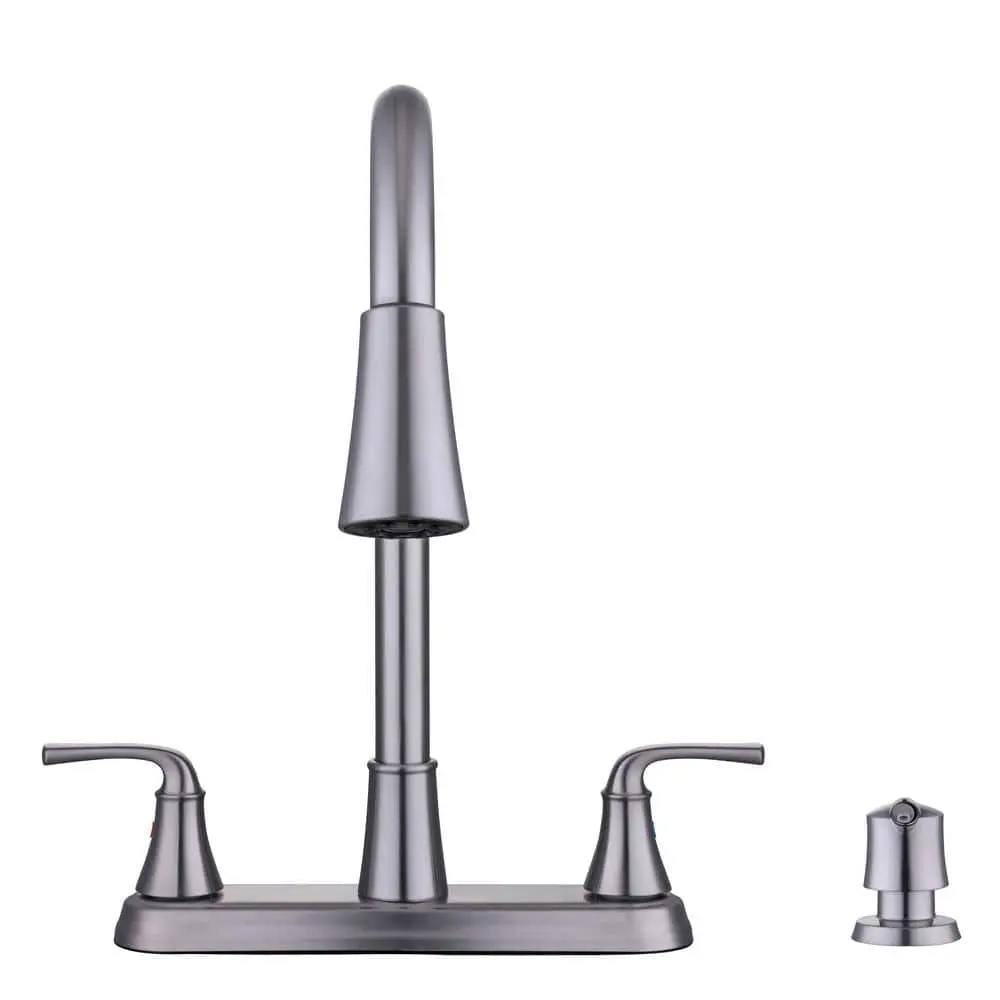The Sadira Double Handle Pulldown Sprayer Kitchen Faucet with Soap Dispenser in Stainless Steel combines simplicity, elegance, and functionality. Its versatile design complements any kitchen decor, while the double handle setup allows for precise control over water temperature and flow. Easy to install, this faucet is the perfect addition to enhance your kitchen.