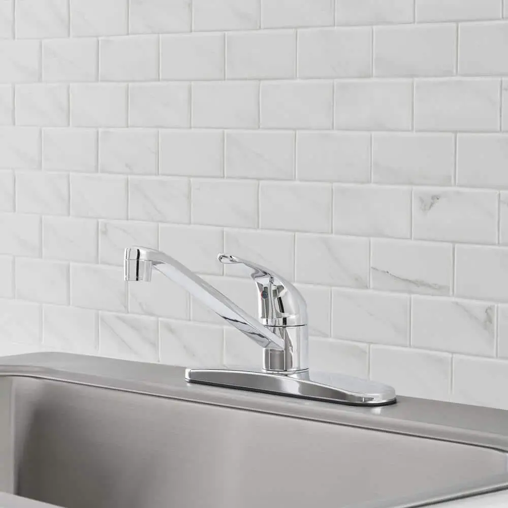 Enjoy convenience and safety for your family with the Glacier Bay Single-Handle Standard Kitchen Faucet in Stainless Steel. ADA-compliant, it boasts a sleek, simple design that adds a clean, modern touch to your kitchen. With a 1.8 GPM flow rate, it delivers strong water pressure to meet your washing needs.