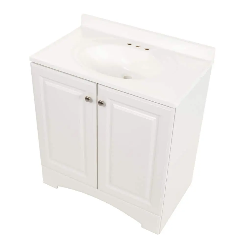 The 30.5-inch wide Glacier Bay bathroom vanity in white showcases a 2-door cabinet and a white cultured marble vanity top. This freestanding unit features a full-overlay raised-panel design, complemented by satin nickel pulls for a timeless appearance. The predrilled white cultured marble vanity top includes an integrated oval sink, finishing off the set. Designed for convenience, this pre-assembled bathroom vanity has an open-back design, 6-way adjustable cabinet hinges, and an unattached vanity top for straightforward installation and plumbing access.