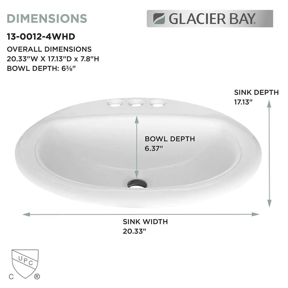 The Glacier Bay Aragon Self-Rimming Bathroom Sink in White is made from vitreous china for durability and long-lasting performance. This drop-in sink includes a front overflow and has pre-drilled holes for 4-inch center-set faucet installation, making it easy to set up. Its oval shape and traditional design are perfect for compact bathrooms, while the white finish enhances a range of decor styles. It also pairs well with other items in the Aragon Collection.