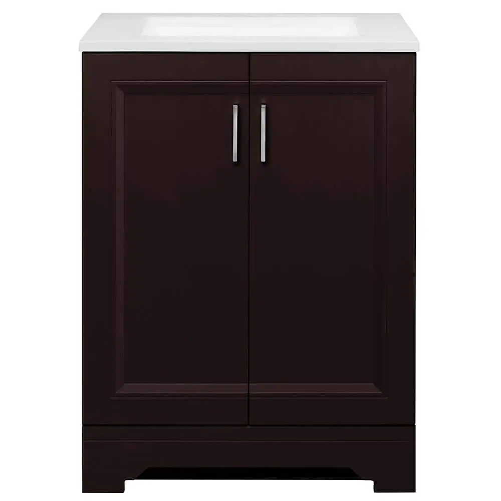 The Glacier Bay Willow Ridge 24.5 in. W Vanity in Carob, featuring a White Cultured Marble Vanity Top with an integral sink and mirror, offers a simple design that enhances various bath or powder room styles. The durable dove gray cabinet provides ample storage for your essentials. The stain and scratch-resistant white cultured marble vanity top is pre-drilled for a 4 in. spread faucet, ensuring easy installation. With decorative accents like stylish cabinet hardware, this vanity adds both functionality and beauty to your space. The cabinet comes fully assembled for effortless installation.