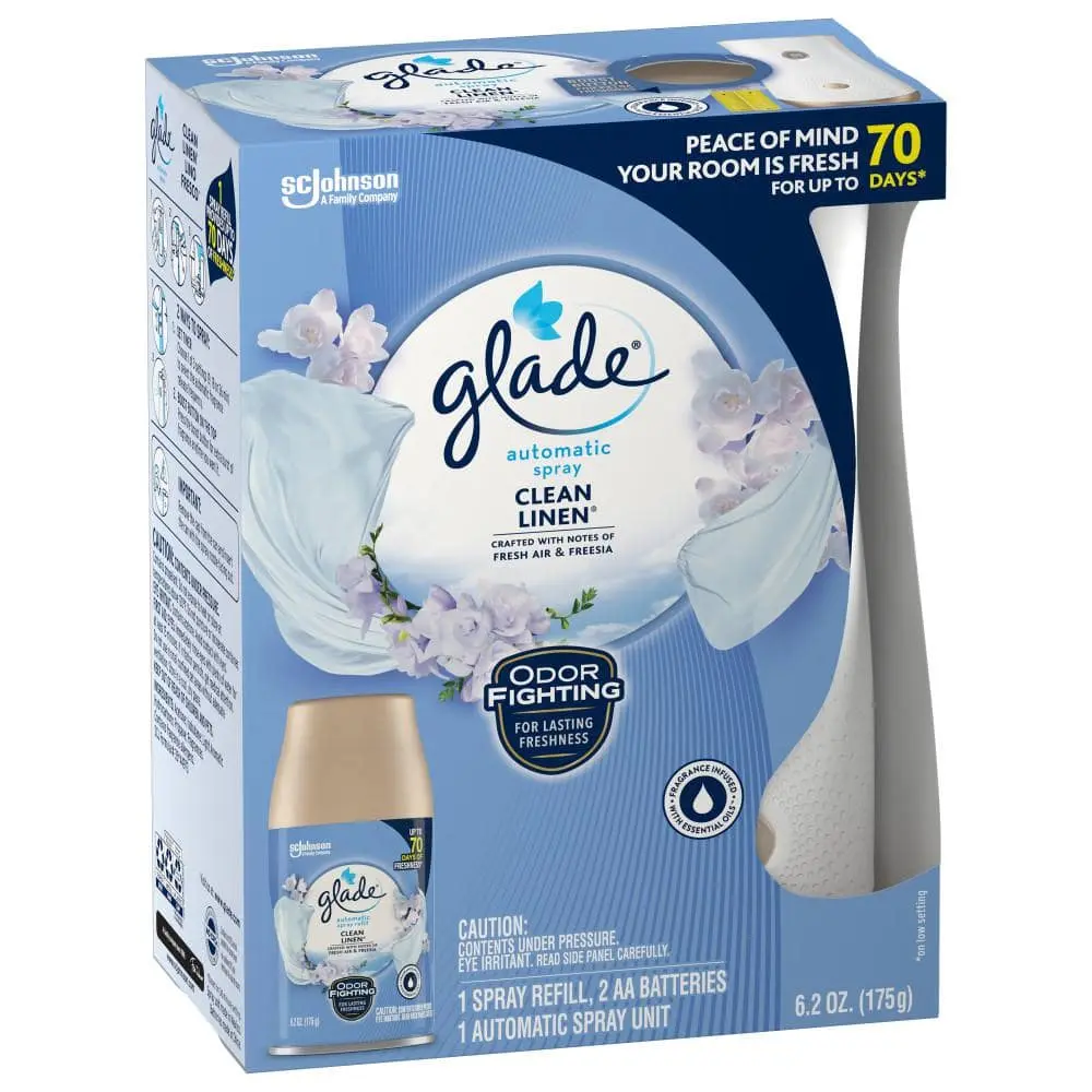 Keep your air fresh with the Glade Clean Linen Automatic Spray Holder + Refill. This fragrance diffuser releases a blend of crisp air, fresh laundry, and lily of the valley, crafted by master perfumers. Simply open the unit by squeezing the sides, insert the refill, and set the timer to release fragrance every 9, 18, or 36 minutes. Infused with essential oils, this automatic air freshener fills your space with the refreshing scent of clean linen.