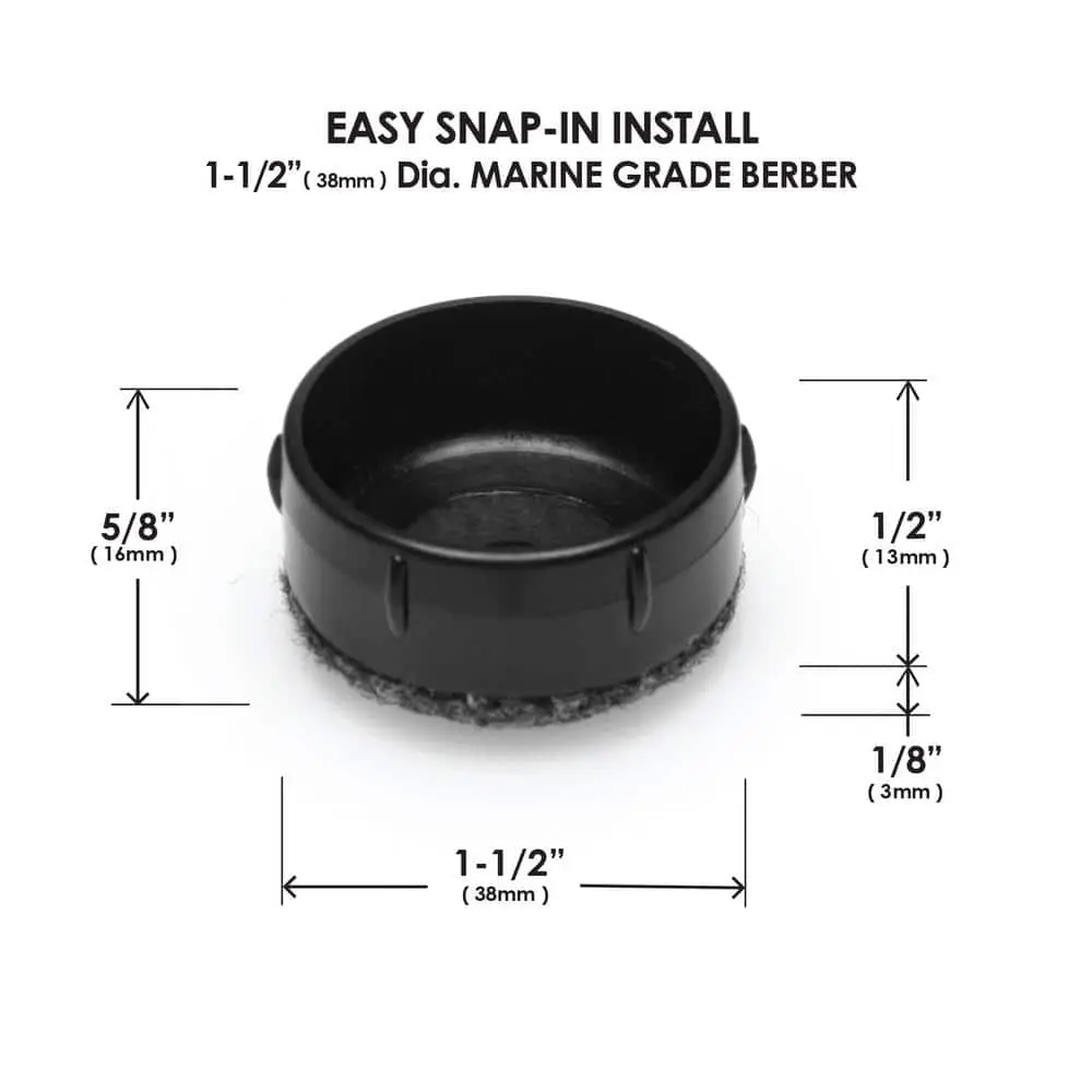 The GorillaOutdoor Wrought Iron Berber feet are high-quality replacement caps for your outdoor patio furniture. Made with marine-grade berber, they provide a quiet, scratch-resistant, and weatherproof surface to protect the bottom of your furniture. These caps also prevent rust marks and damage caused by missing or damaged feet. They are compatible with most outdoor surfaces, including concrete, wood, and composite, and fit 1-1/2 inch inside diameter cups. Installation is simple with a rubber hammer or mallet. For best results, remove any dirt, debris, or rust, and touch up exposed metal before installation.