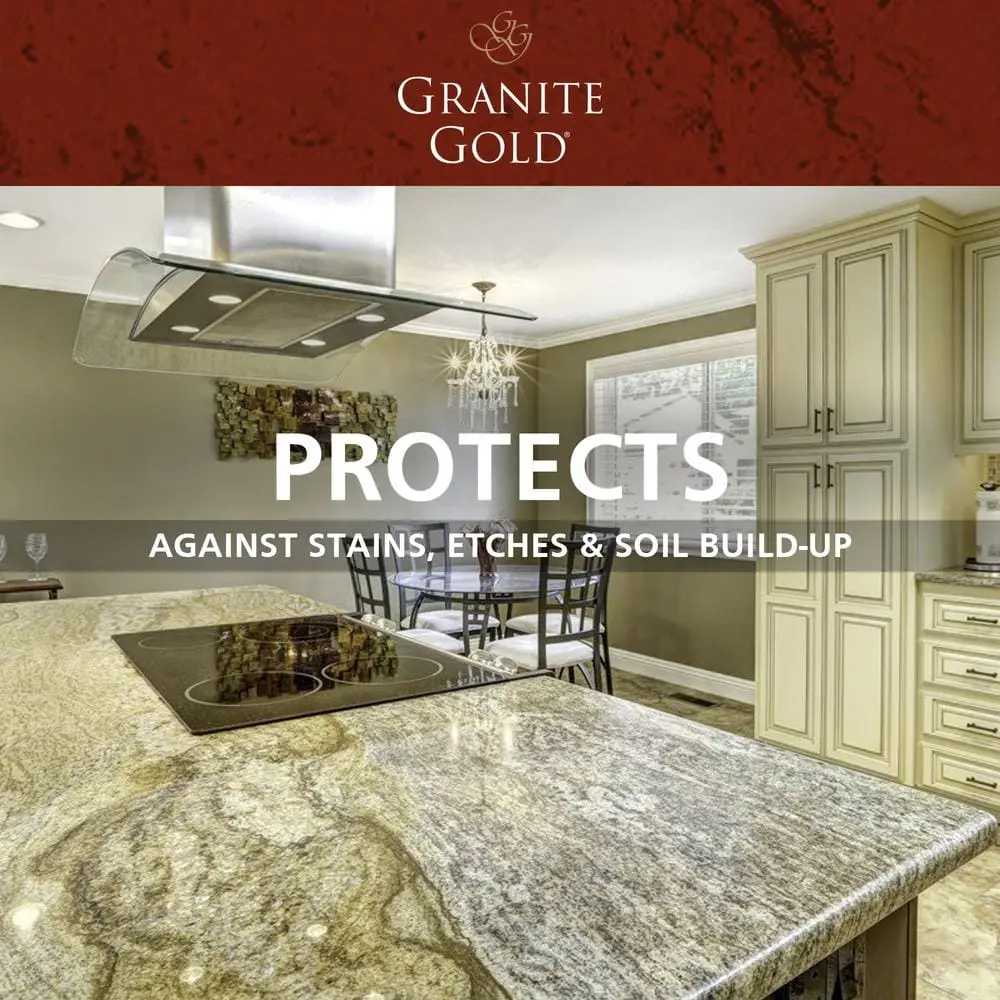 The Granite Gold Multi-Surface Countertop Sealer is a 24 oz. spray designed to seal and protect natural stone surfaces like granite, marble, and travertine. Its water-resistant formula helps prevent stains and etching caused by spills, ensuring long-lasting beauty. This non-toxic, non-acidic, and pH-balanced sealer is safe for kitchen countertops and can be applied with ease using its spray-and-wipe application. For the best results, frequent use is recommended to maintain optimal protection and shine