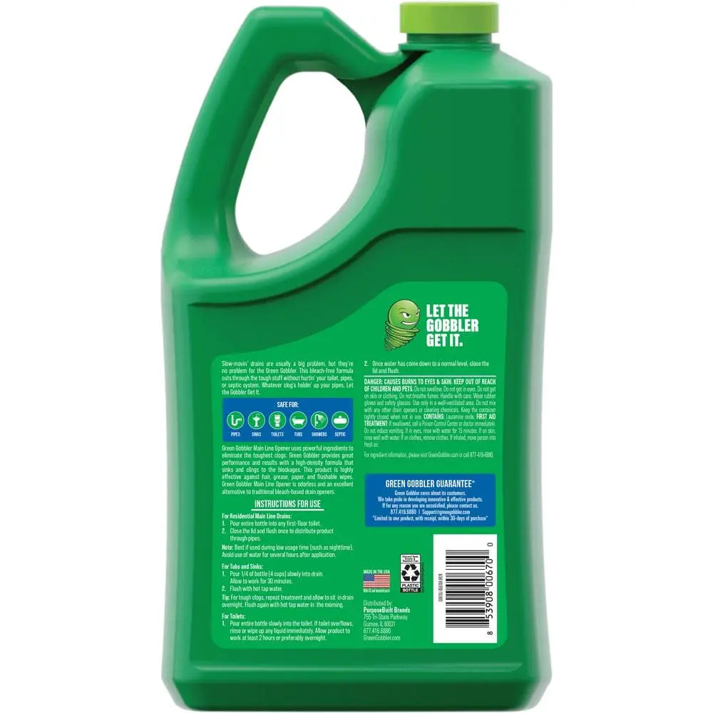 Eliminate slow-moving drains with Green Gobbler Main Line Opener. Its bleach-free formula efficiently breaks down hair, sludge, flushable wipes, and other organic materials, ensuring your main line stays clear. This powerful cleaner can reach clogs up to 50 feet from the drain. For main line clogs, just pour it into a first-floor toilet, flush, and avoid using the drain for 10-12 hours. Safe for all pipes and septic systems, it’s free from sodium hydroxide, bleach, and harsh odors.