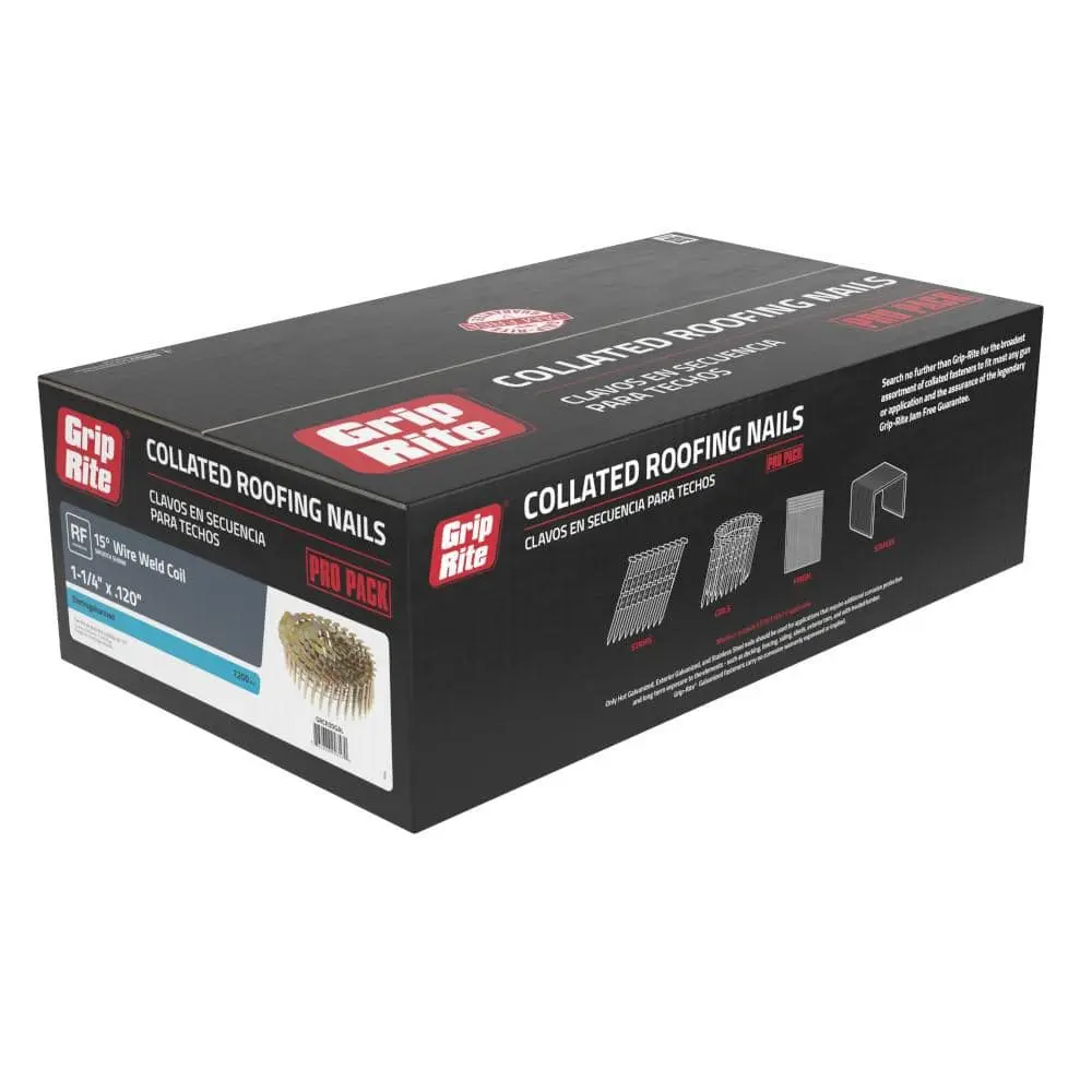 Grip-Rite GRCR3DGAL 1-1/4 in. x 0.120-Gauge 15° Smooth Shank Electrogalvanized Wire Collated Coil Roofing Nails are designed for use with most 15° pneumatic nailers to securely fasten shingles to roofs. These nails are electrogalvanized for enhanced corrosion resistance and come in a pack of 7,200 smooth shank, wire-collated steel nails. All Grip-Rite collated nails are supported by the Grip-Rite Jam Free Guarantee.