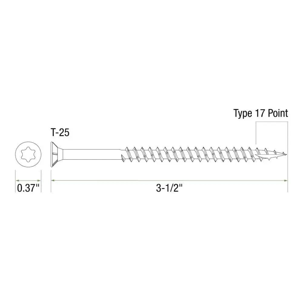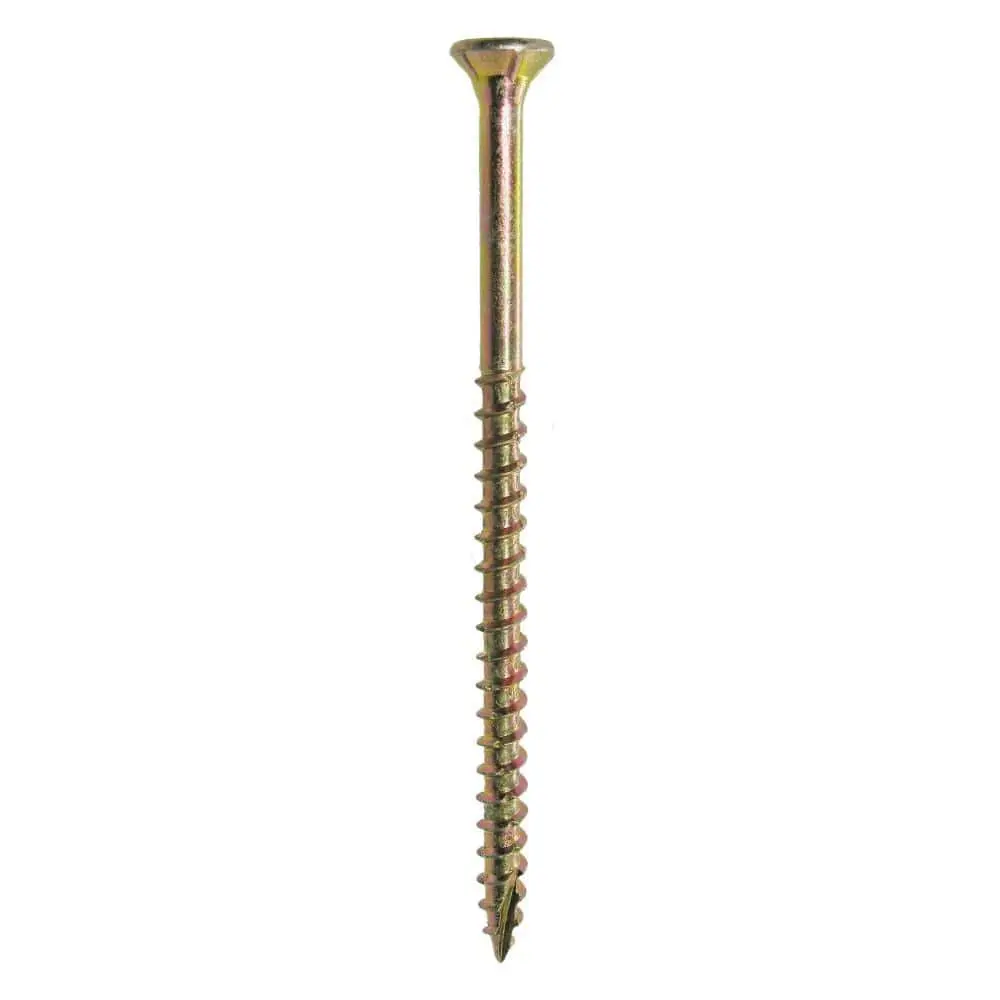Grip-Rite 212GCS5 #10 x 3-1/2 in. Star Drive Dual Flat Head Coarse Thread Construction Screws are designed for wood-to-wood applications, eliminating the need for pre-drilling with their T17 point. The coarse auger threads minimize splitting and accelerate installation. The star drive ensures a secure connection and handles more torque with less slippage than traditional designs. The yellow zinc coating offers corrosion resistance and enhances the appearance of wooden construction projects.