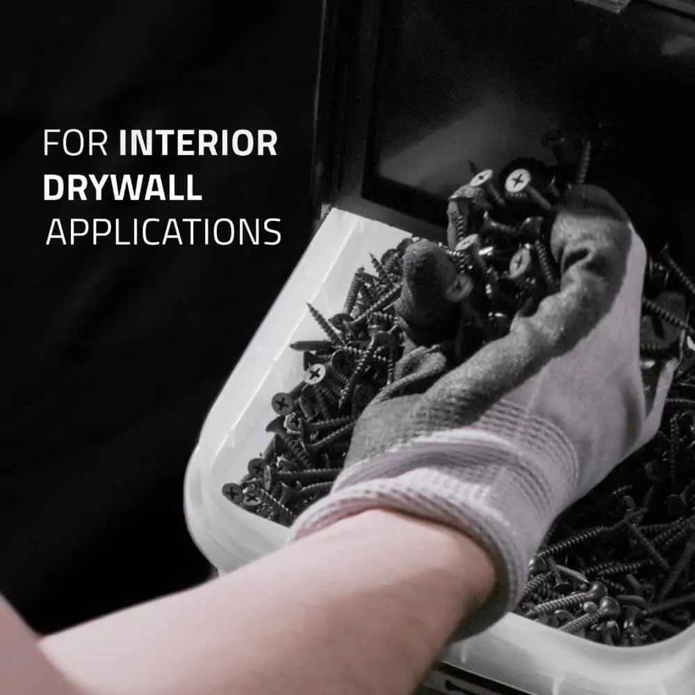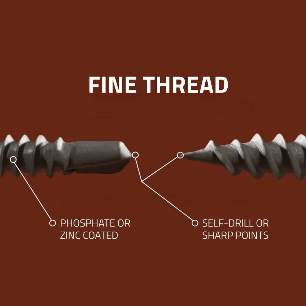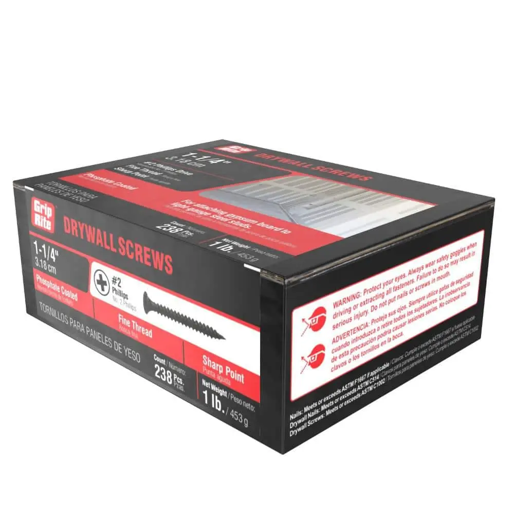 Grip-Rite 114DWS1 #6 x 1-1/4 in. #2 Phillips Bugle Head Fine Thread Drywall Screws are ideal for interior drywall installations. These hand-drive fasteners feature a black phosphate coating for enhanced corrosion resistance and improved mud adhesion, making them perfect for securing gypsum drywall to light gauge metal studs. A trusted choice in the construction industry, these screws are known for their reliable performance.