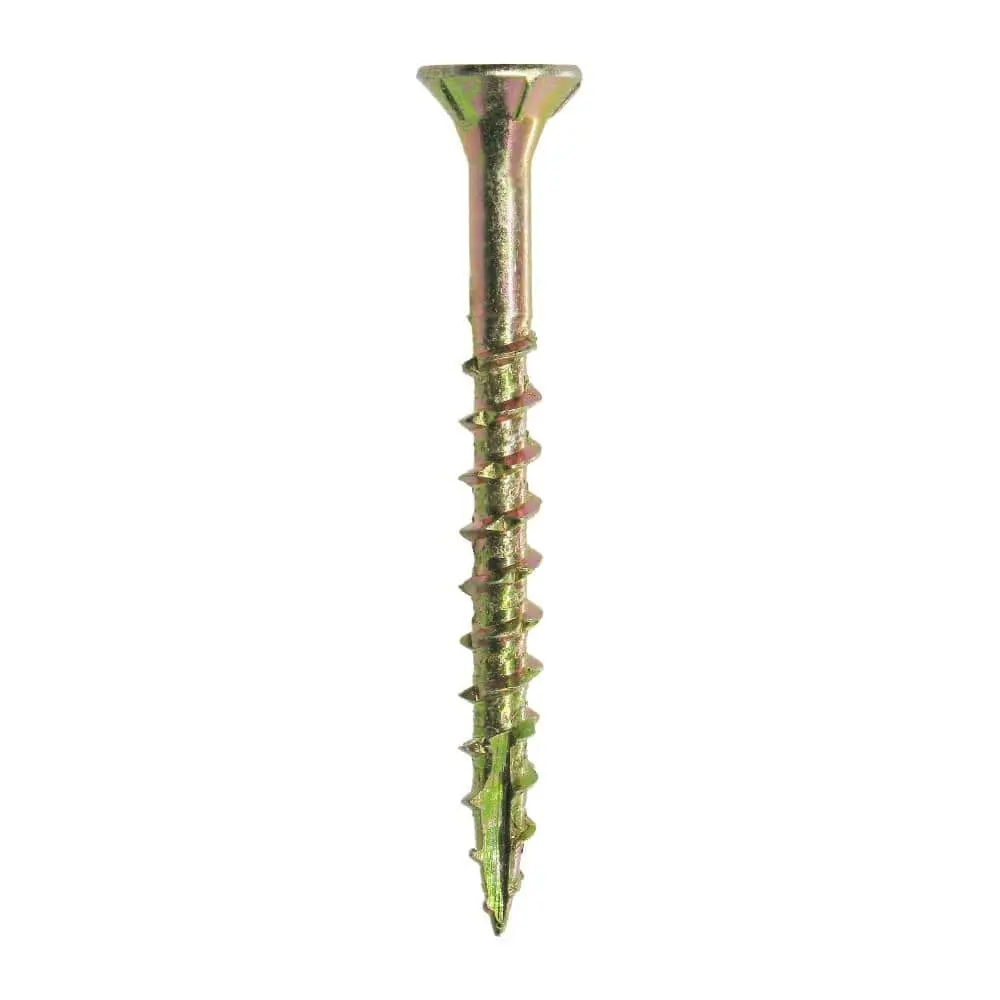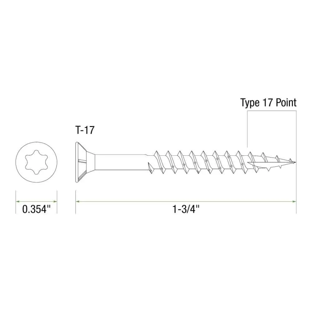 Grip-Rite 134GCS1 #8 x 1-3/4 in. Star Drive Dual Flat Head Coarse Thread Construction Screws are crafted with a T17 point, eliminating the need for pre-drilling during construction. Specifically designed for interior wood-to-wood applications, the coarse auger threads help minimize splitting while speeding up installation. The T-25 star drive ensures greater control, reduces slippage, and handles higher torque. A yellow zinc coating adds corrosion resistance and an appealing finish to wooden construction projects.