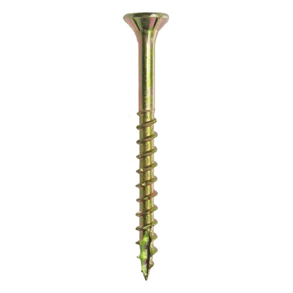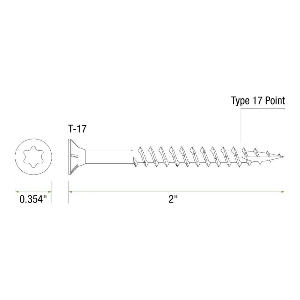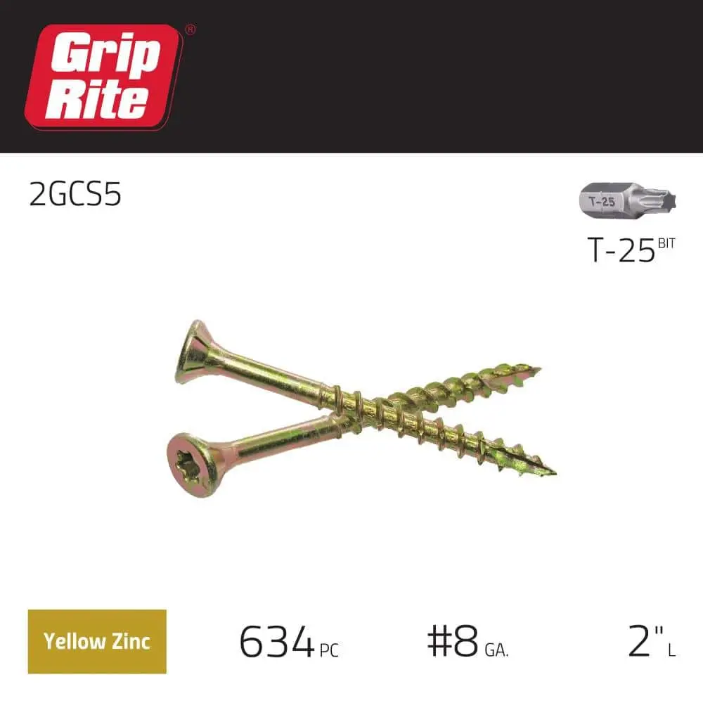 The Grip-Rite 2GCS5 #8 x 2 in. Star Drive Dual Flat Head Coarse Thread Construction Screws are designed for efficient interior wood-to-wood applications. Featuring a T17 point, these screws eliminate the need for pre-drilling, while coarse auger threads help prevent splitting and speed up installation. The star drive system minimizes slippage and delivers greater torque. A yellow zinc coating enhances corrosion resistance and adds a polished look to wood projects.
