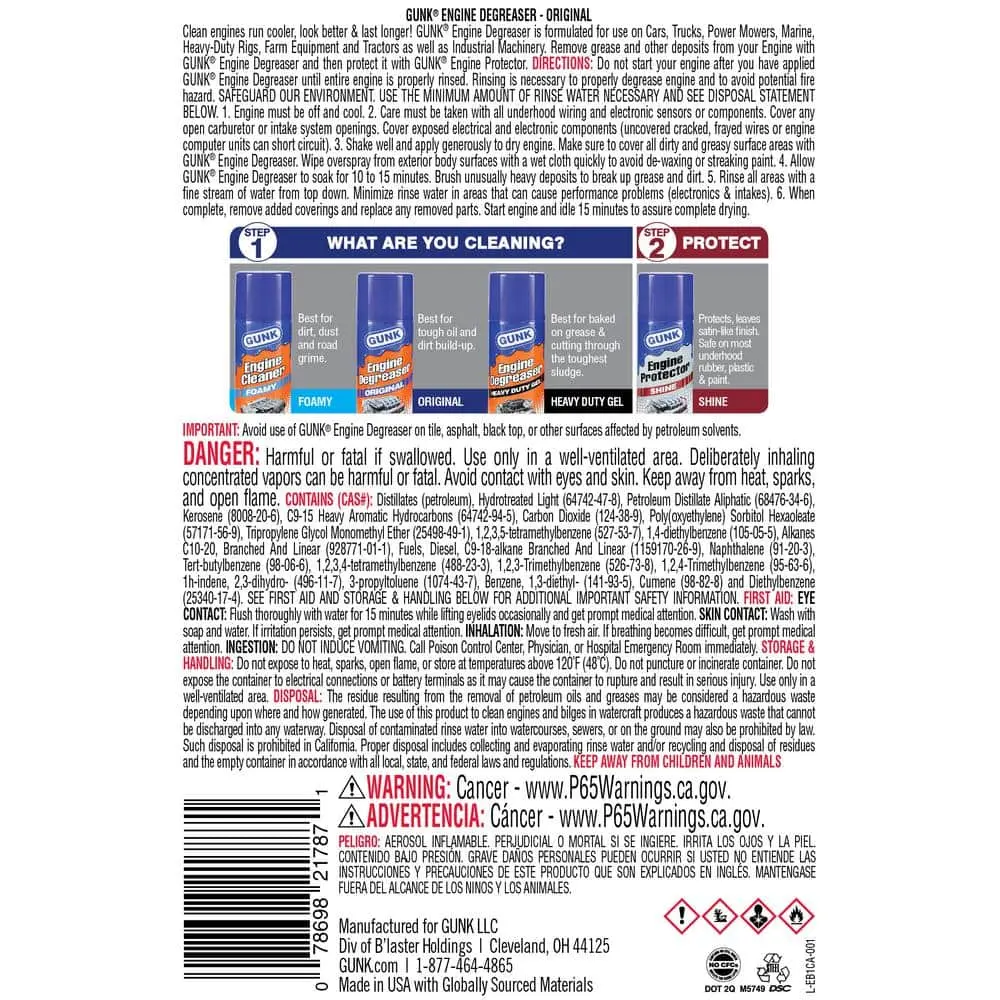 Gunk Original Degreaser is designed to tackle the toughest oil and grease, providing heavy-duty cleaning for even the most hard-working engines. It's ideal for use on cars, trucks, power mowers, RVs, ATVs, bikes, farm equipment, tractors, and more.