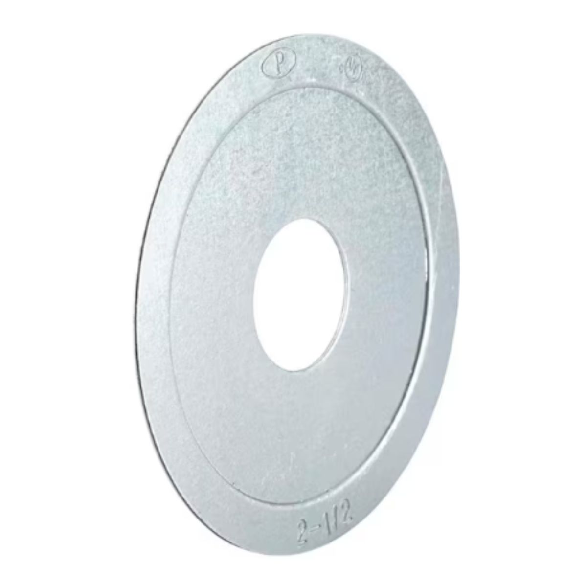 The Halex 2 inch by 1-1/2 inch Conduit-Reducing Washer is meticulously engineered to minimize the size of the knockout in a steel outlet box or any metal enclosure, ensuring a precise fit for electrical conduits. Crafted from galvanized steel, this washer boasts exceptional durability and resilience against corrosion, making it suitable for both indoor and exterior applications. Its corrosion-resistant properties enhance longevity and reliability, making it an ideal choice for a wide range of electrical installations requiring dependable performance in varying environments.