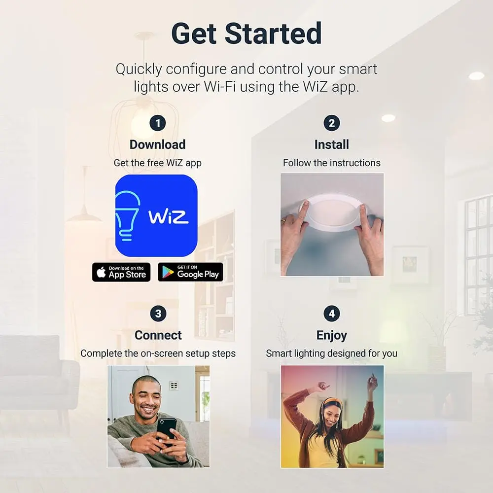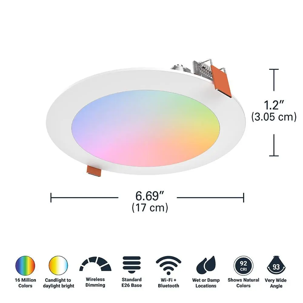 Installing, setting up, and controlling these HALO smart lights is a breeze with WiZ Pro. Illuminate your space with the perfect lighting by using the WiZ app to set up and control lights on your local Wi-Fi. Choose from warm-to-cool white or full-color lighting, and select from preset scenes like Candlelight or Party Mode. The Circadian Rhythm preset mimics natural sunlight indoors. Control your smart lighting from home, remotely, or with voice commands. Professional installers can use the WiZ Pro Setup App and online WiZ Pro Dashboard to effortlessly manage multiple projects. These fixtures are just 1/2 inch thin, mounting directly to the ceiling with no housing needed, and are perfect for areas where traditional downlighting can't fit. They work with Google Assistant, Amazon Alexa, Siri Shortcuts, IFTTT, and Samsung SmartThings, and are compatible with all WiZ Pro and Connected by WiZ products. Transform your lighting experience with HALO's WiZ Pro-enabled products.