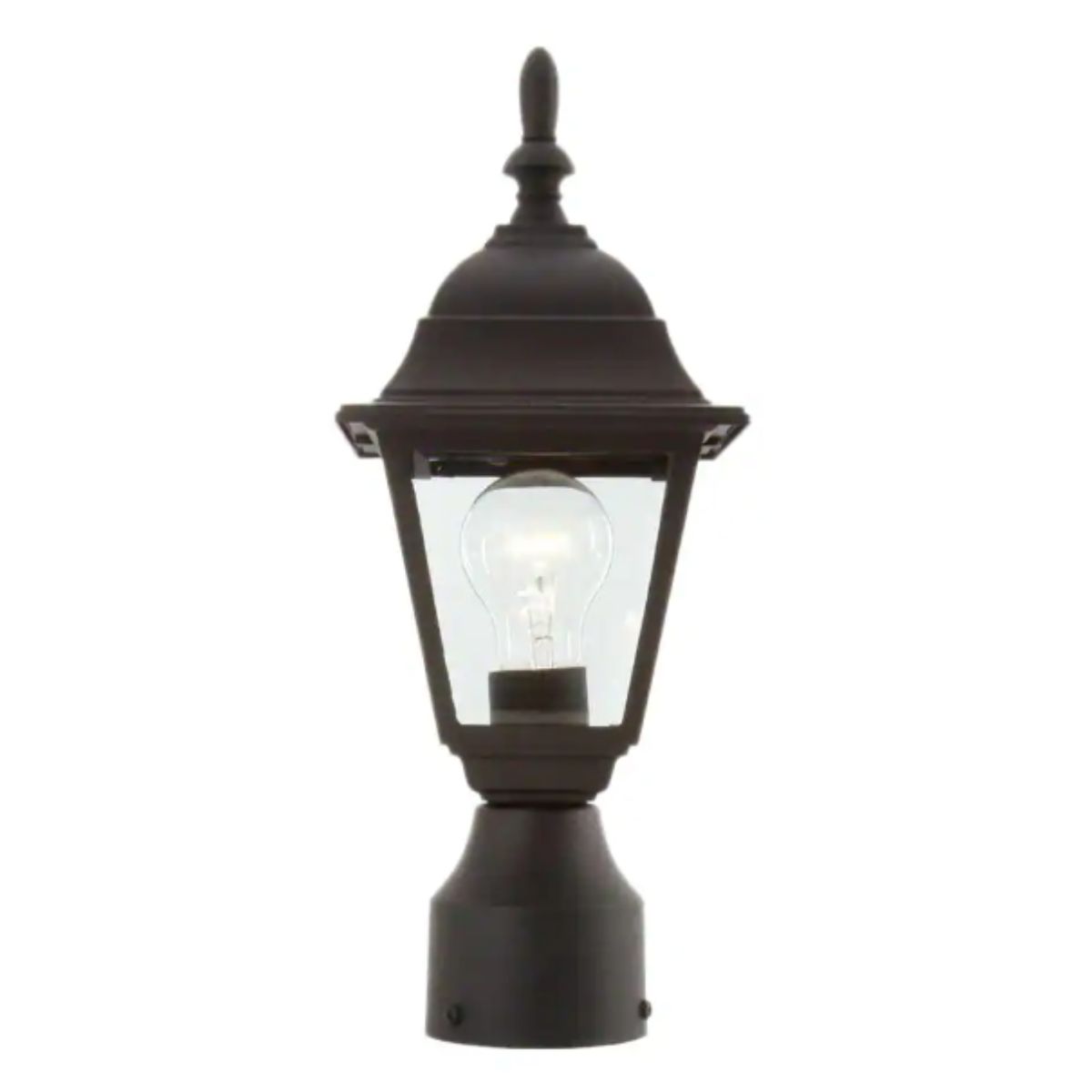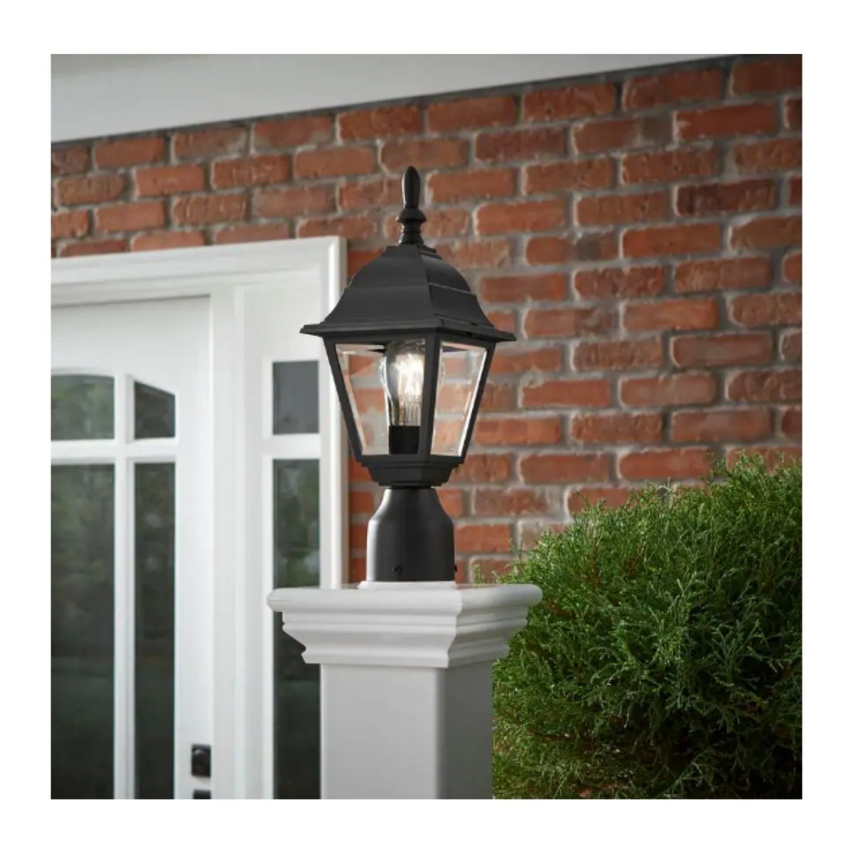 The Hampton Bay 1-Light Outdoor Post Lamp features a timeless square housing design, enhanced by a sturdy black finish. The clear beveled glass adds a touch of elegance to this conventional style, making it an ideal choice for driveways, patios, and various outdoor areas.