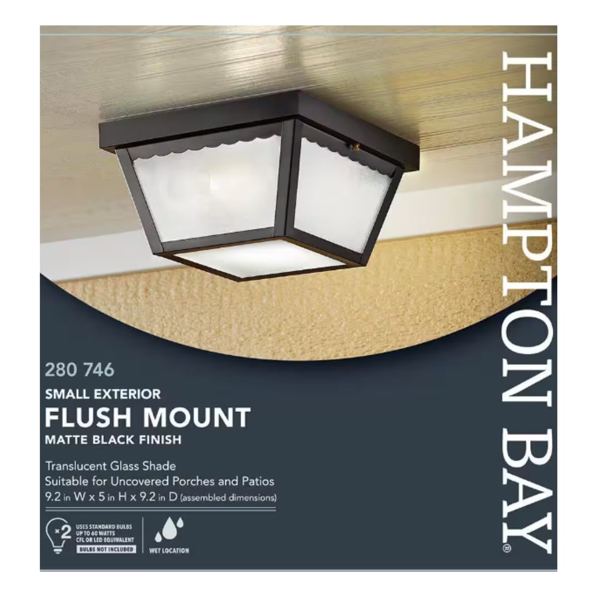 The Hampton Bay 2-light Matte Black Ceiling Mount is designed with a sleek low profile, making it perfect for use in outdoor spaces like the patio, as well as indoor areas such as the basement or garage. Its translucent glass panels effectively diffuse the light, while the black housing adds a touch of simple yet stylish elegance.