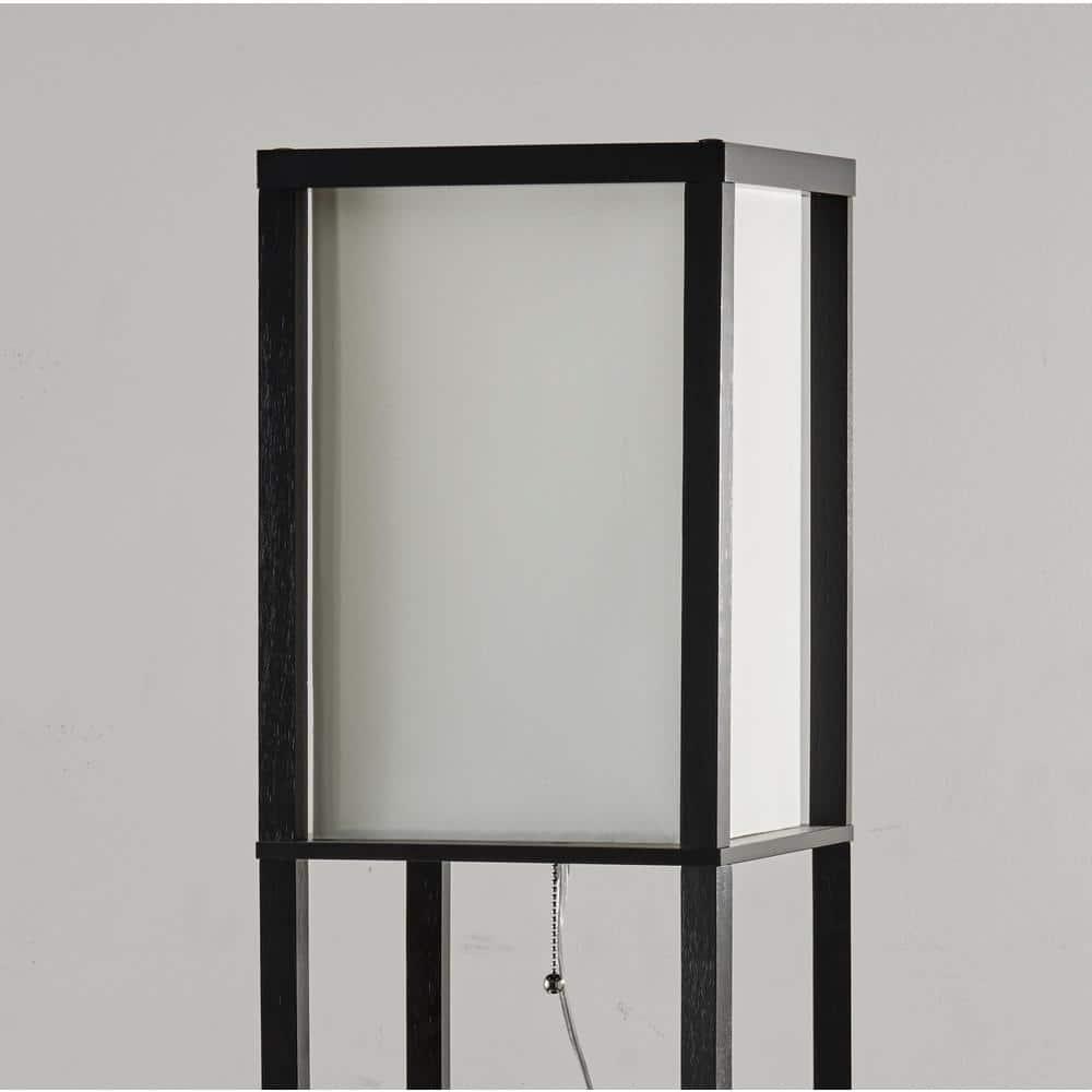 Experience high style and versatility with the Wright shelf floor lamp. This elegant piece features a black walnut wood open box frame and includes two additional display/storage shelves, making it a practical addition to any living room, media room, den, office, or bedroom. The base is square, enhancing its modern design.