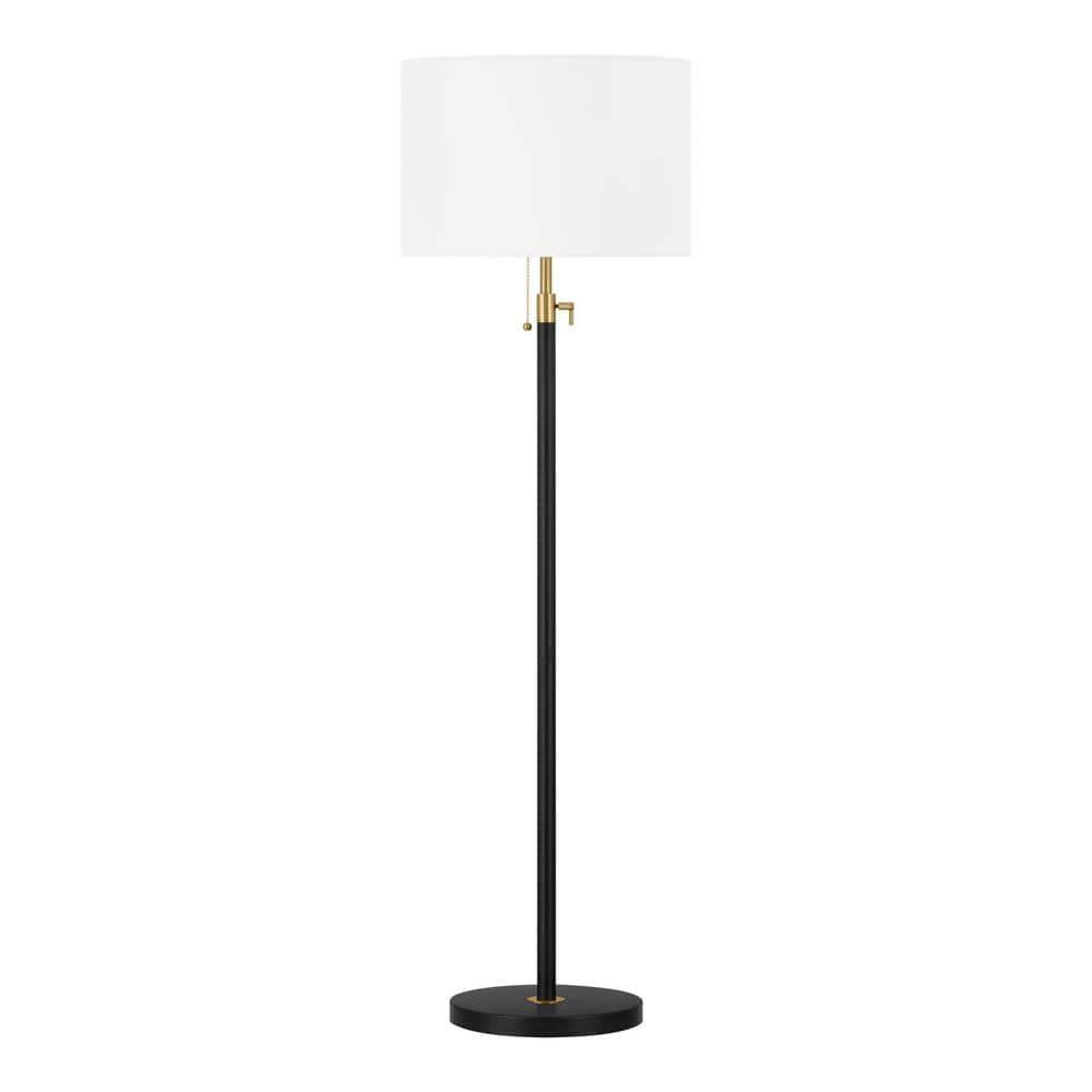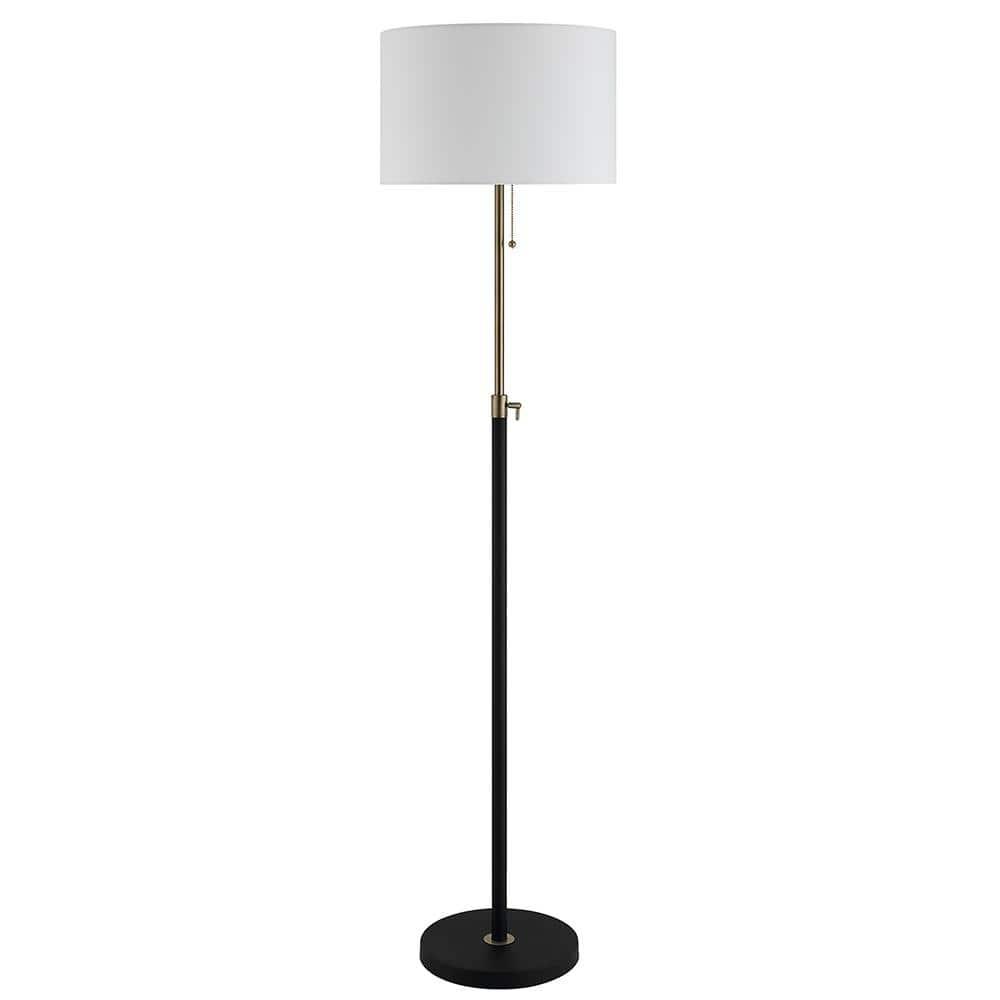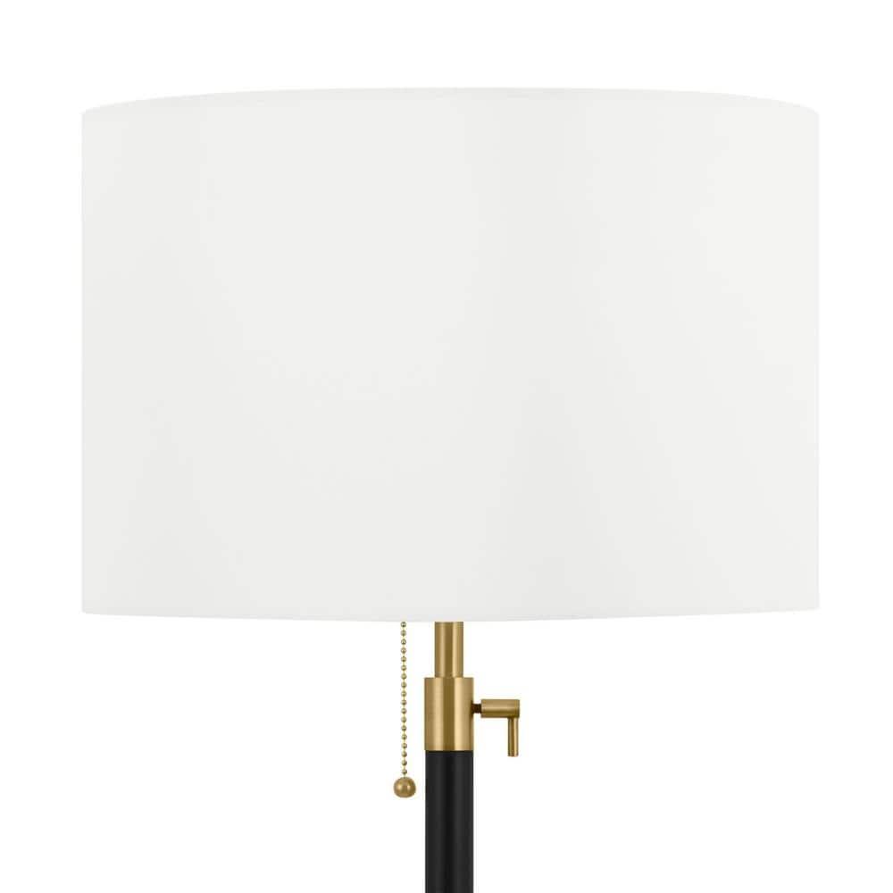 The Alderston adjustable floor lamp is a stylish and versatile lighting fixture designed to enhance your interior dor. Made of metal, it boasts a round base and a slender body with a matte black and antique brass finish. The adjustable height feature allows you to tailor the lamp to your specific lighting and dor needs. It comes with a simple, drum-shaped shade in a soft off-white hue. Finished with a pull chain for easy operation, this floor lamp is perfect for bedrooms, offices, and living rooms.