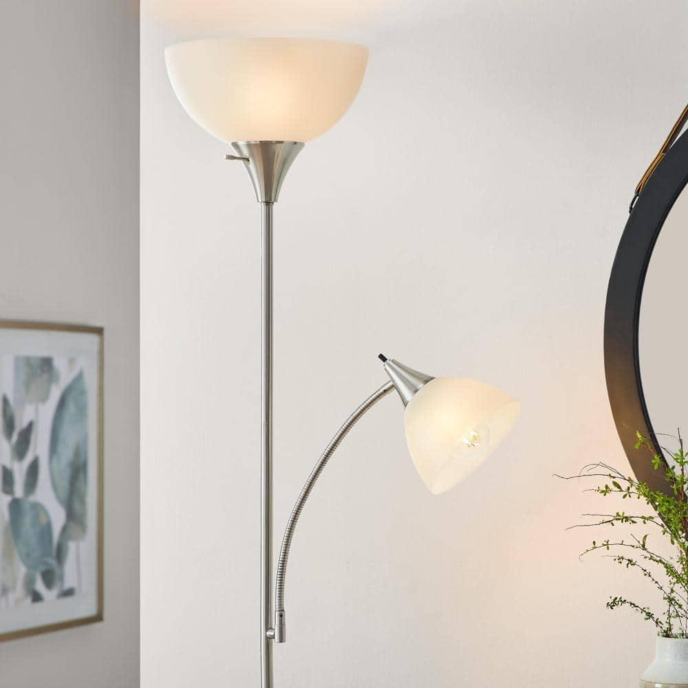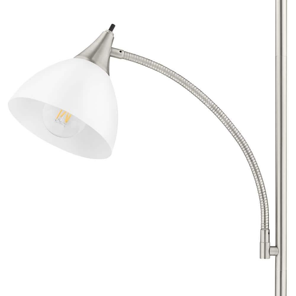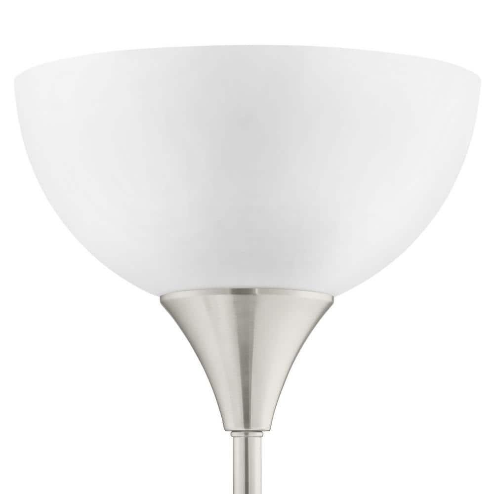 This 2-Light, 70-inch mother-daughter floor lamp features a sleek brushed nickel finish paired with a white plastic shade. Its contemporary design adds a modern touch to your home dor. The lamp accommodates an E26 light source with one 100-watt 3-way bulb and one 60-watt Type A bulb (bulbs not included). The convenient rotary switch allows you to adjust the brightness to your preference. ETL certified for safety, this lamp ensures both style and security for your home.