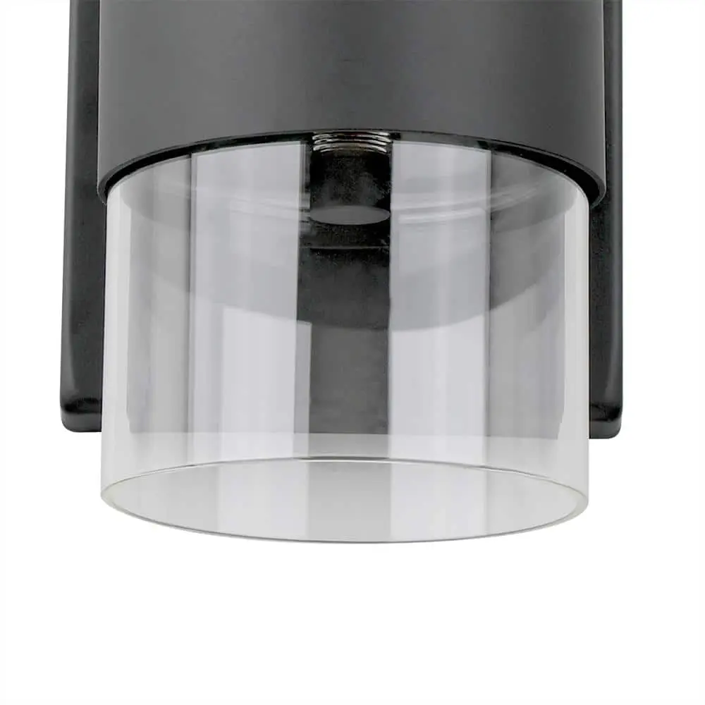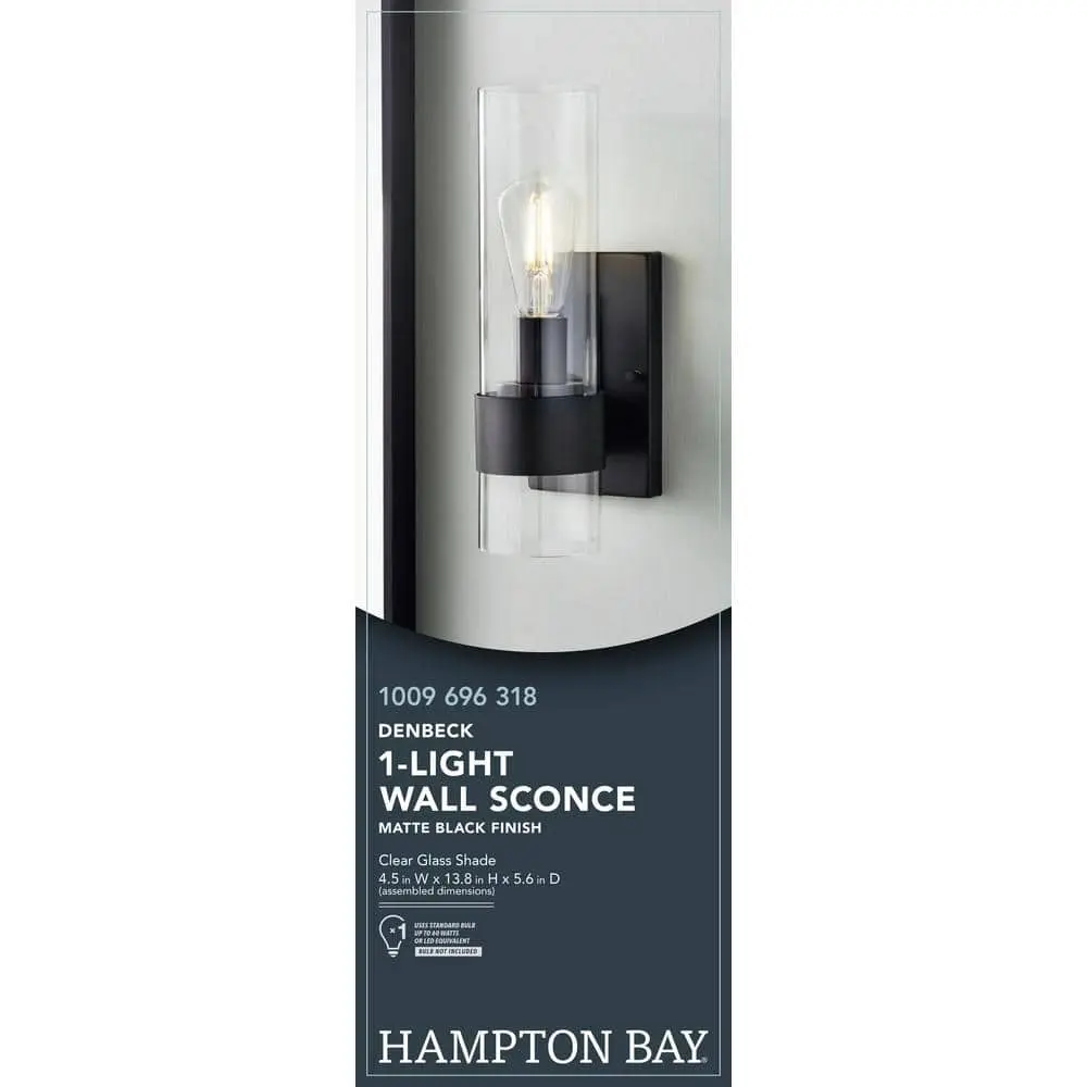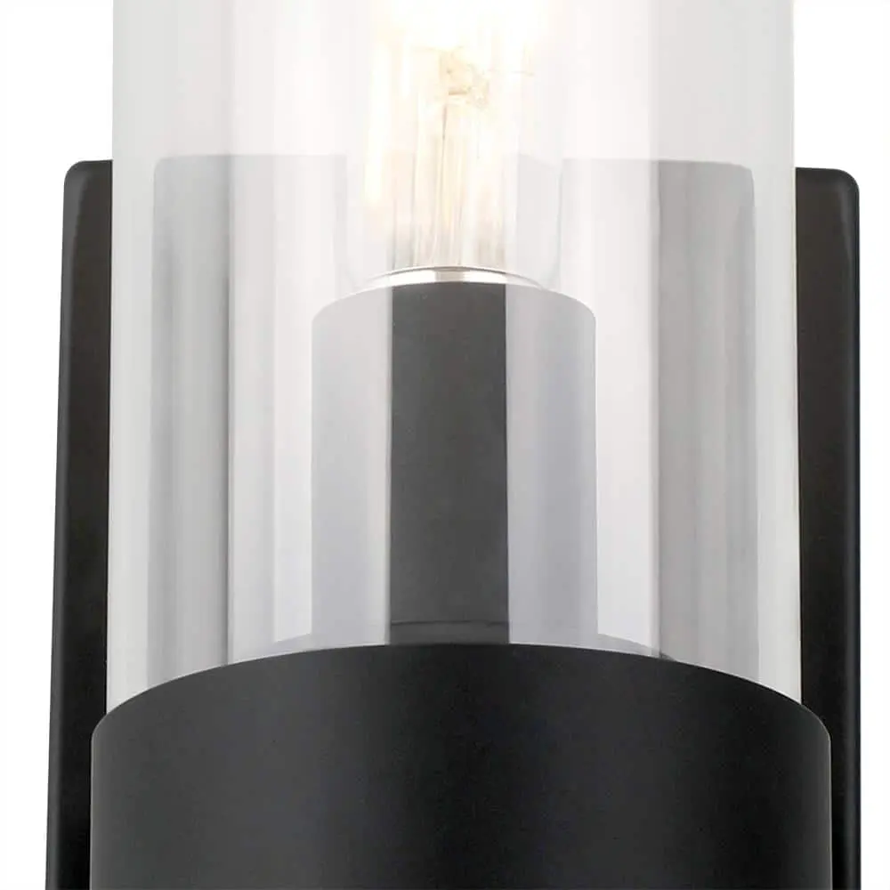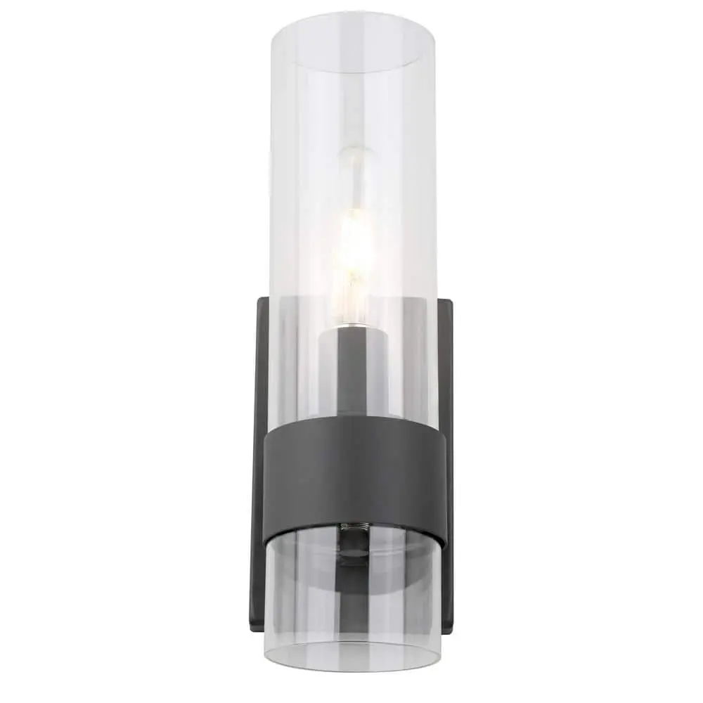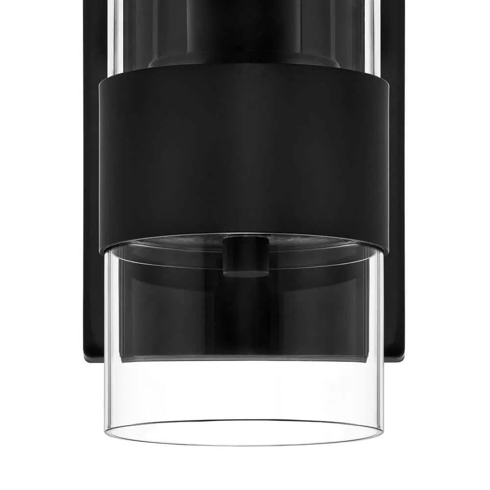 This sconce features a modern minimalist design, showcasing a sleek metal band that secures a clear glass cylinder, with an Edison bulb glowing like a flickering candle inside. The matte black finish adds a polished touch to this elegant fixture.