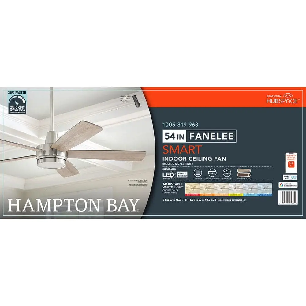 The 54-inch Fanelee Smart Ceiling Fan by Hampton Bay is a great addition to any smart home. This fan provides various control options, including remote control, the HubSpace App for smartphones or tablets, and voice control through Alexa or Google Assistant. It features an integrated 31-watt LED light with 6 adjustable color temperatures, ranging from 2700K to 6500K. The fan’s elegant brushed nickel finish is paired with a durable frosted shatter-resistant plastic shade, designed to mimic frosted glass. Perfect for large indoor rooms, the Fanelee offers quiet, efficient operation with a 4-speed reversible motor for year-round comfort.
