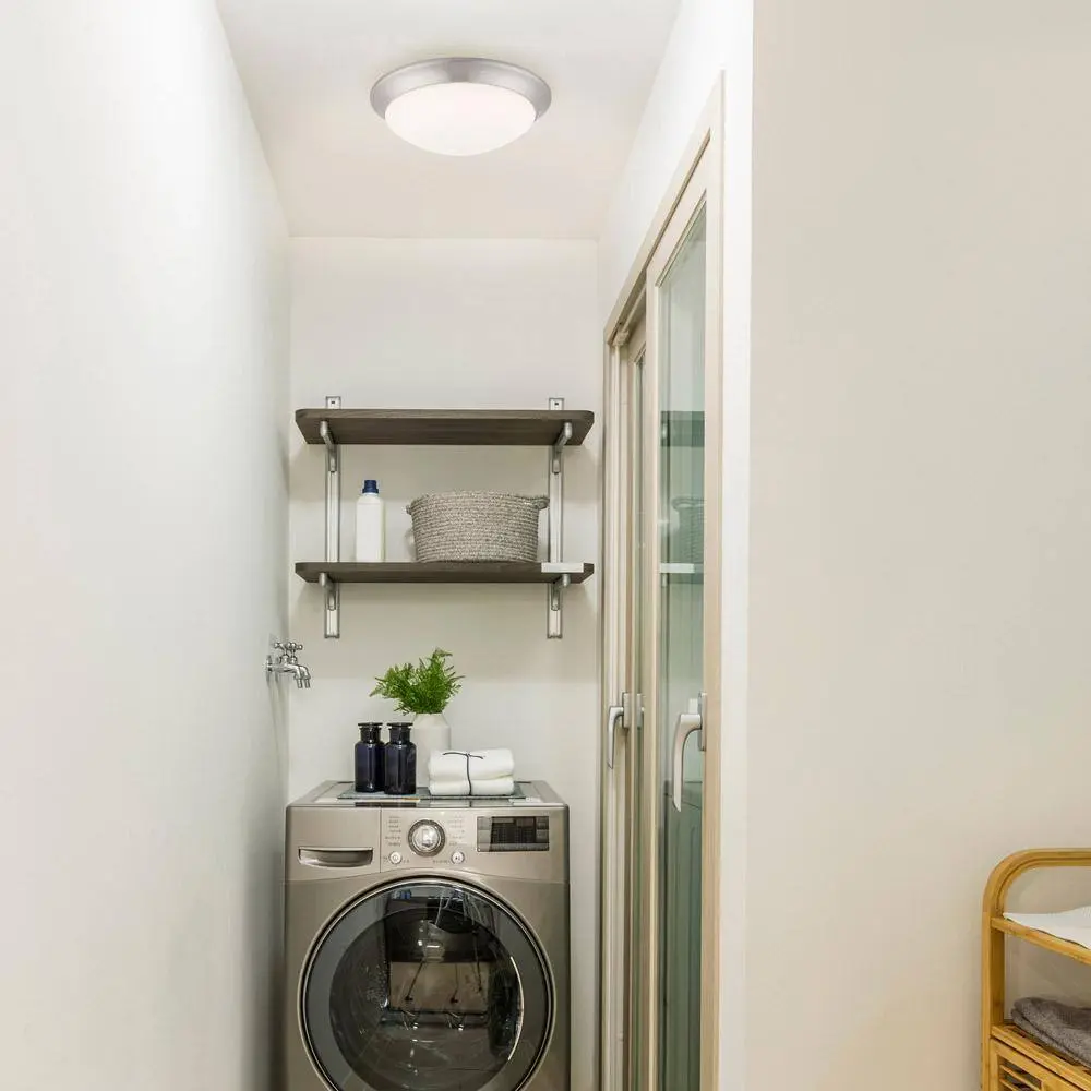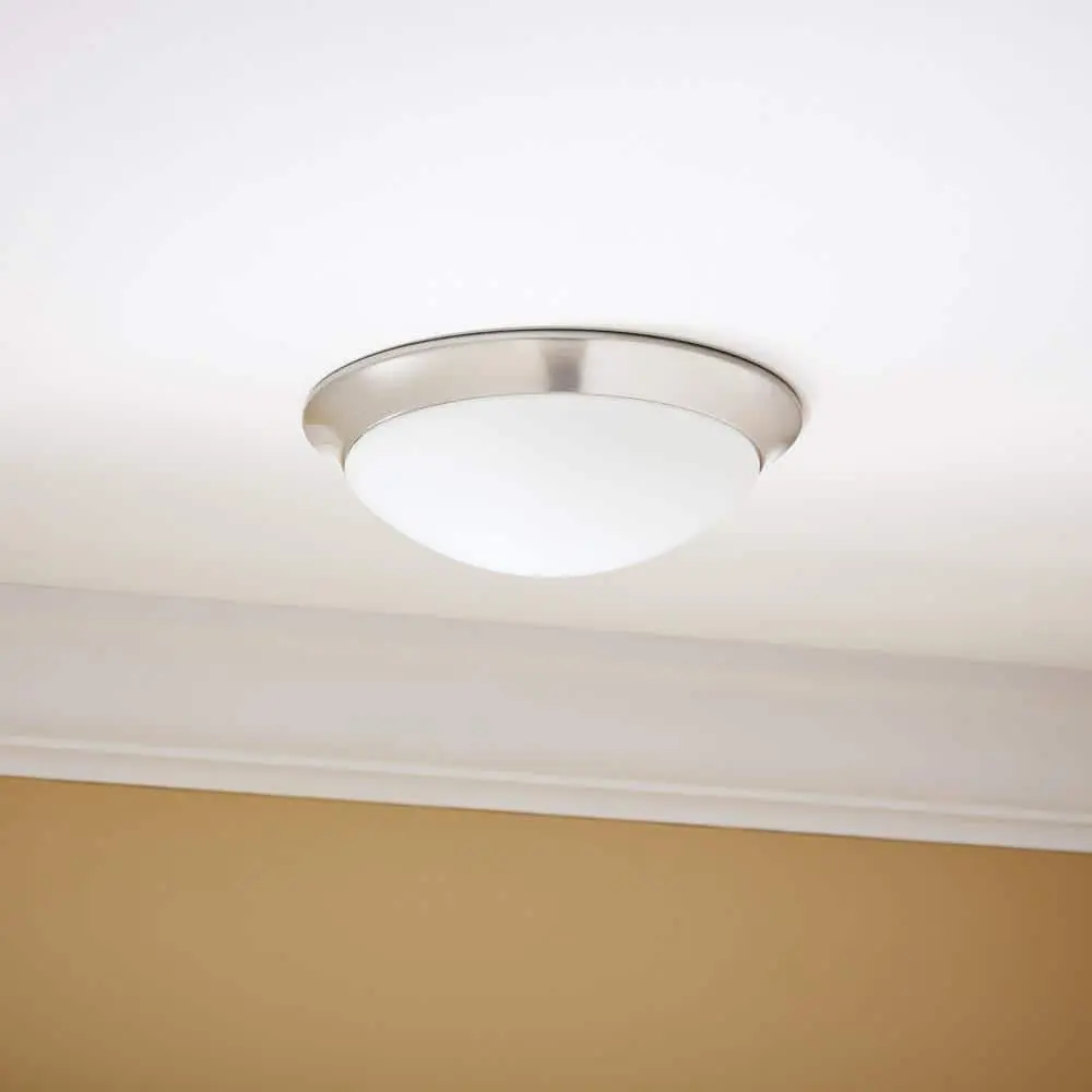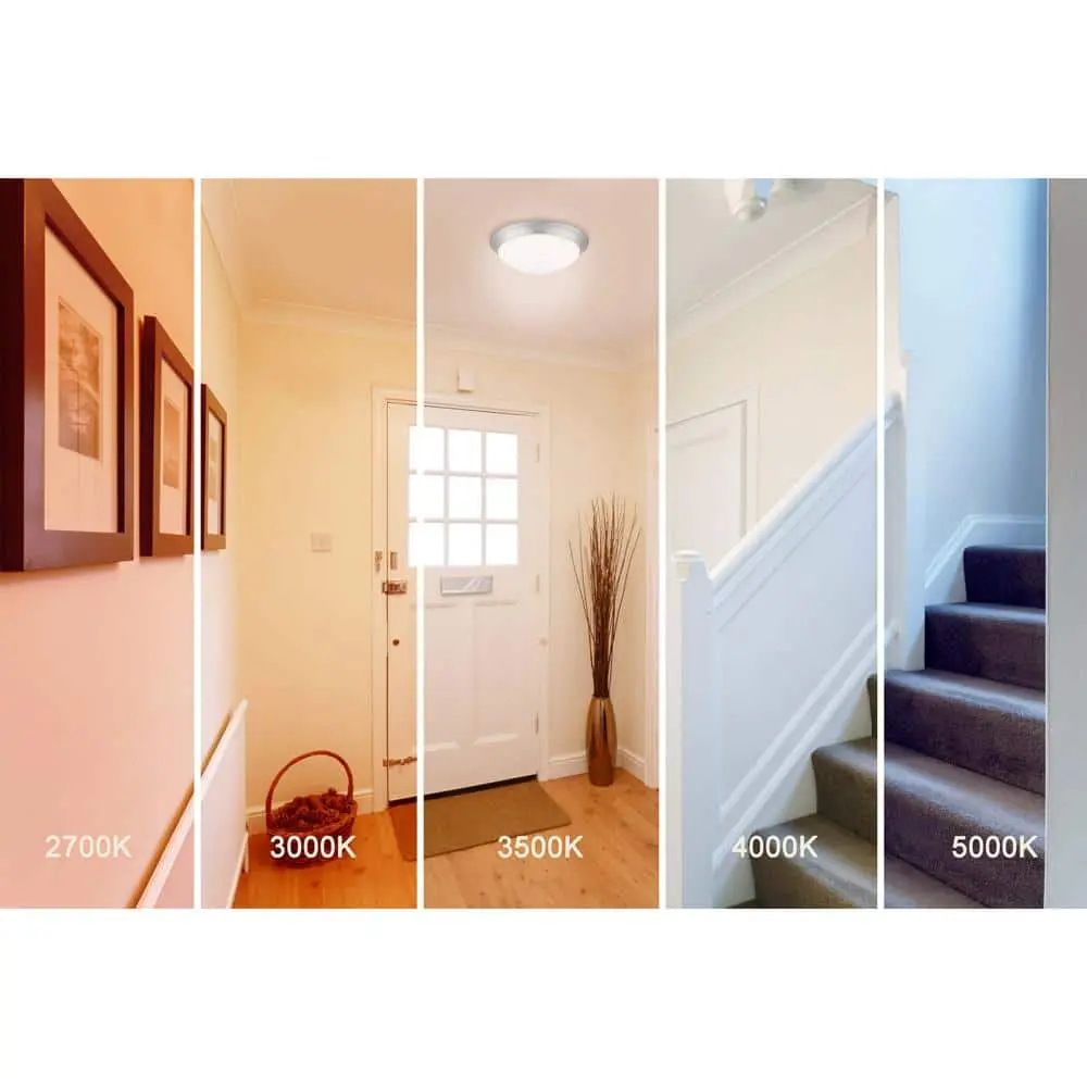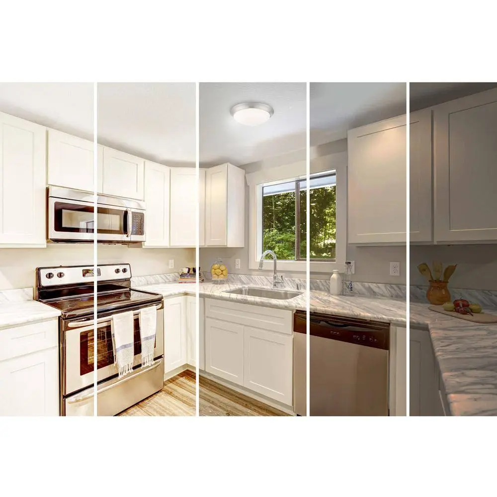 The Stetson 11 in. round integrated LED ceiling flush mount from Hampton Bay offers a sophisticated and adaptable lighting solution for any room in your home. With 5 color temperature settings, you can create the ideal ambiance: warm 2700K, soft 3000K, neutral 3500K, bright 4000K, and daylight-like 5000K. The fixture features a sleek Brushed Nickel finish and a frosted white glass diffuser, making it a versatile addition to any interior style. The integrated LED ensures you never need to replace a bulb, and it delivers 1,000 Lumens—equivalent to a 60W incandescent bulb. Installation is quick and easy with included hardware and instructions.