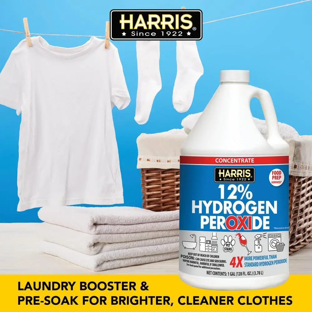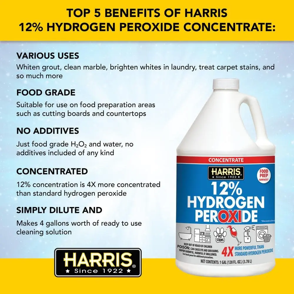 Hydrogen peroxide is known for being one of the purest and most versatile chemicals available. With its powerful oxidizing properties, it serves as an effective bleaching agent, stain remover, and all-purpose cleaner. At 12% concentration, it is 4 times stronger than standard hydrogen peroxide. The formula contains no additives—just food-grade H2O2 and water. Harris Peroxide is safe for use on food prep surfaces like cutting boards and countertops. It's perfect for whitening grout, cleaning marble, brightening whites in laundry, tackling carpet stains, and much more. Each bottle makes up to 4 gallons of ready-to-use cleaning solution. For best results, dilute with distilled water.