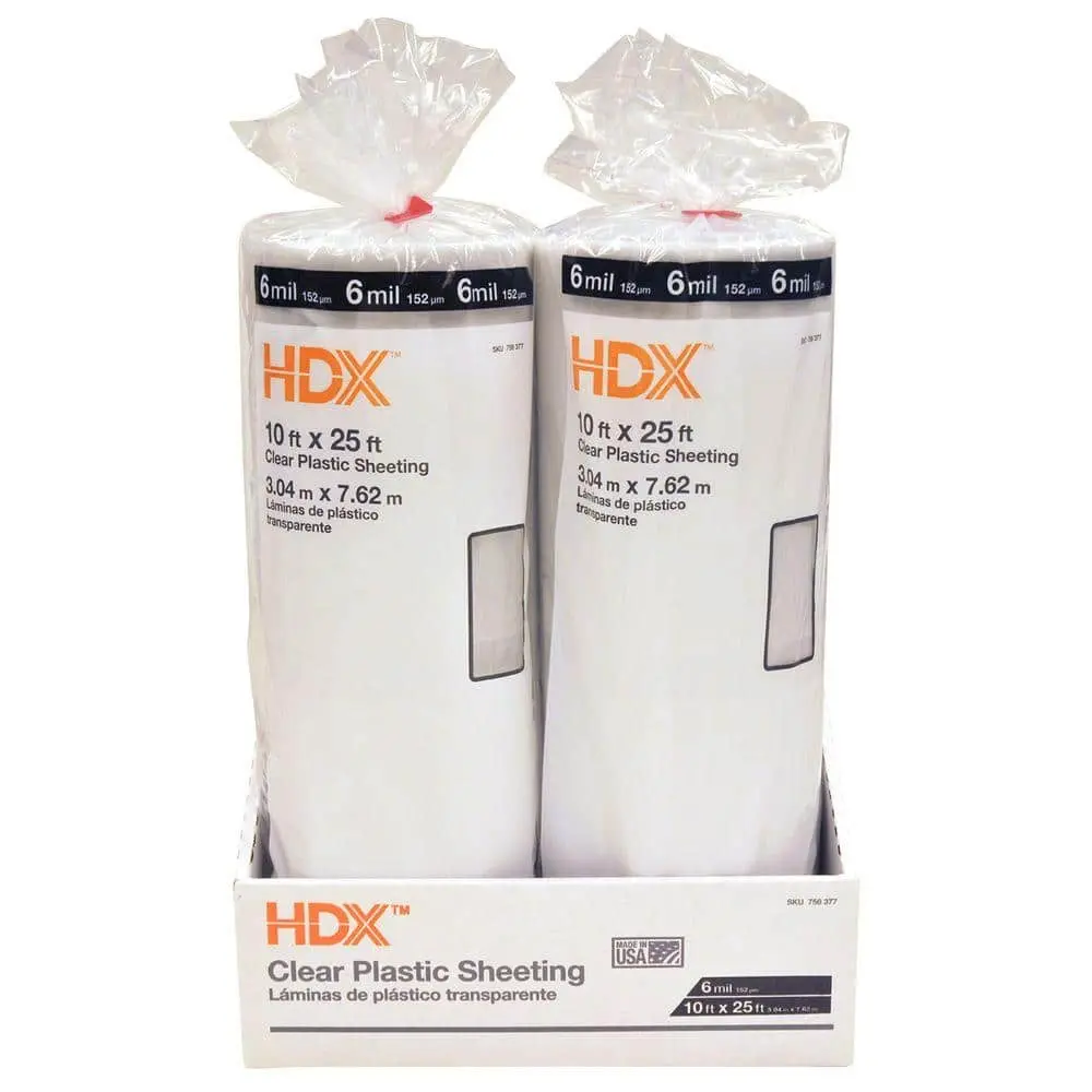 The HDX 10 ft. x 25 ft. Clear 6 mil Plastic Sheeting offers a 6 mil thickness, providing strong and durable protection for heavy-duty applications. Made from clear material, it allows visibility while effectively covering and protecting surfaces. With large coverage of 10 ft. x 25 ft., it offers ample protection for various projects. This sheeting is waterproof, safeguarding surfaces from moisture and spills, and is also tear-resistant, ensuring it withstands rough handling and foot traffic. Its versatile use makes it ideal for construction, painting, and temporary coverings.