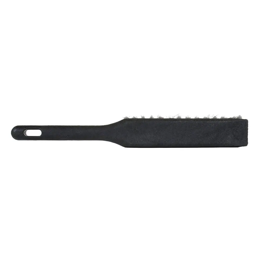The 14 in. Bench Broom features flagged polypropylene plastic bristles that effectively capture even the smallest dirt particles in your workspace. Its angled design allows for easy access to tight corners, while a built-in scraper edge on the brush head helps remove stubborn dirt. Perfect for both vertical and horizontal surfaces, this brush is an essential tool for restaurants and commercial kitchens.