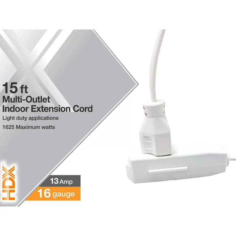 The HDX 15 ft. 16/3 Indoor Multi-Outlet Extension Cord is ideal for indoor use in home offices or living spaces. This long extension cord is perfect for powering indoor holiday lights, small appliances, and more. It features 3 grounded outlets and a molded 3-prong banana plug, with a 13 Amp, 125-Volt, 1,625-Watt electrical capacity.