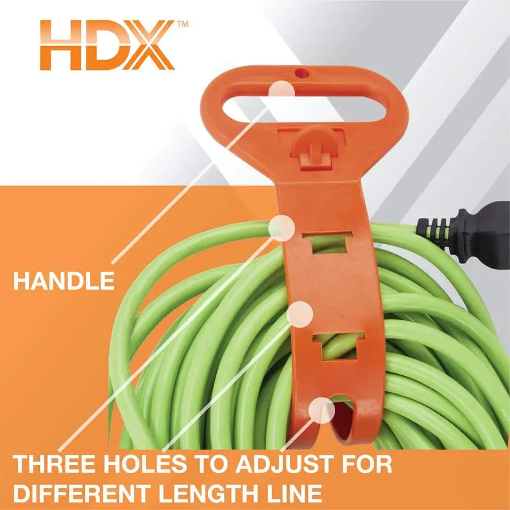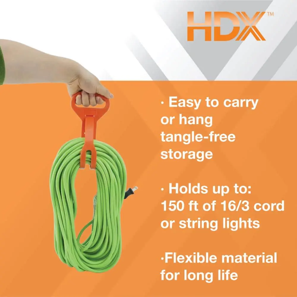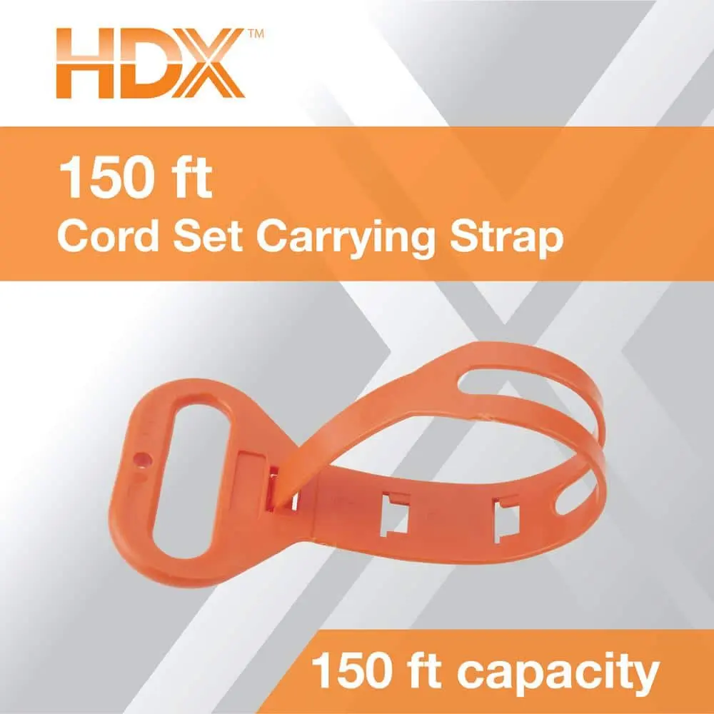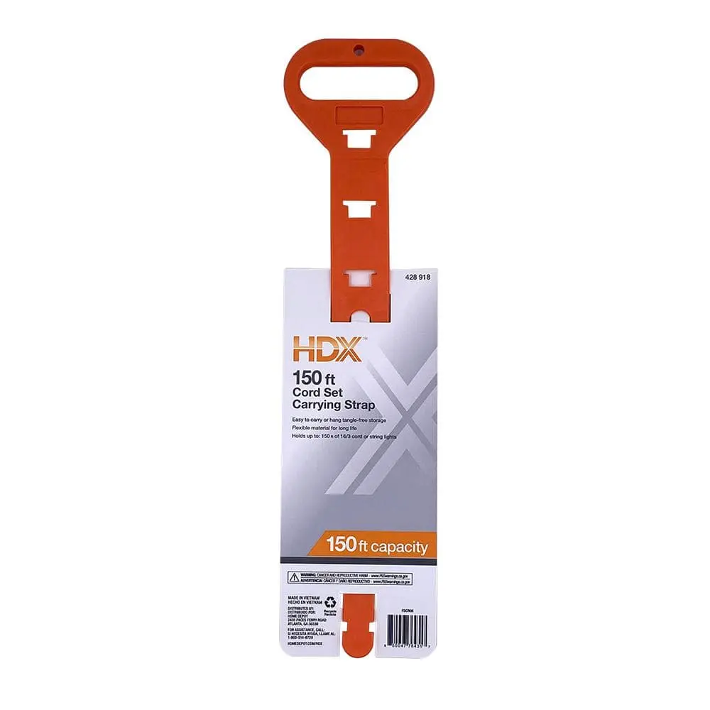 The HDX short carry strap offers a quick and easy solution to secure coiled cords. With a length of 15 inches, it holds up to 150 feet of 16/3 extension cord. This versatile strap is perfect for organizing rope, hose, chain, or even holiday lights. The carry handle makes it easy to transport or hang, while the durable, flexible thermoplastic material ensures long-lasting use.