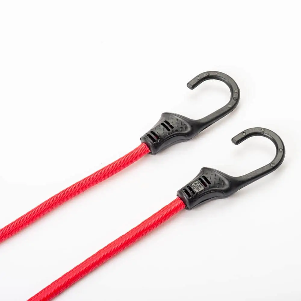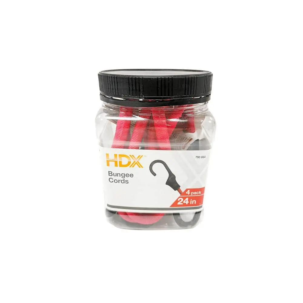 The HDX 24 in. Super Strong Bungee Cord (4-Pack) offers reliable fastening for a variety of uses. Each cord is made from strong, durable elastic with reinforced hooks, providing secure support for medium to heavy items. Designed to be weather-resistant, these bungee cords can withstand UV rays and harsh conditions, making them perfect for outdoor, storage, and transportation needs. The 24-inch length provides flexibility, while the 4 cords per pack offer added convenience for multiple tasks