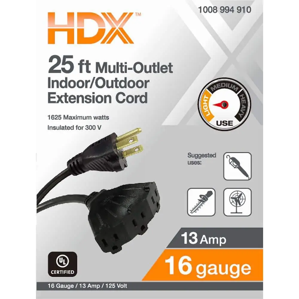 The HDX 25 ft. 16/3 Triple Tap Extension Cord is designed for both indoor and outdoor use, making it perfect for job sites or household tasks. Rated for 13 Amp and 125-Volt, this extension cord is equipped with reinforced blades and molded plugs to prevent bending and breaking. It is cULus Listed, ensuring durability and flexibility, with 3 outlets for easy connection of multiple devices.