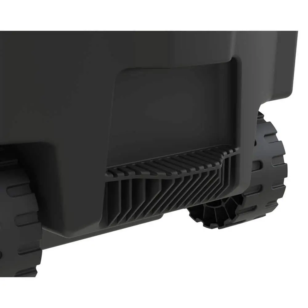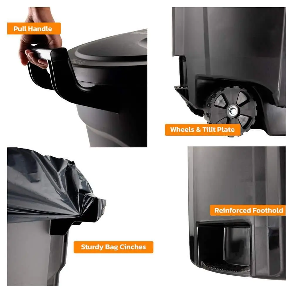 The HDX 32 Gal. trash can with wheels is built for durability and residential convenience. Its sleek black design complements various outdoor settings, while 3.75-inch wheels make it easy to move. The reinforced foothold and venting channels simplify liner removal. Features like the snap-fit lid, ergonomic pull-handle, and bag cinches make disposal effortless. Made from high-quality UV-resistant resin, it resists fading, cracking, and crushing. The reinforced rounded handles and durable base provide easy lifting and dragging, even under heavy loads. Designed for efficiency and longevity, the trash can also includes contoured base handles and an integrated rib structure for improved grip. HDX combines functionality with style for a reliable waste management solution.