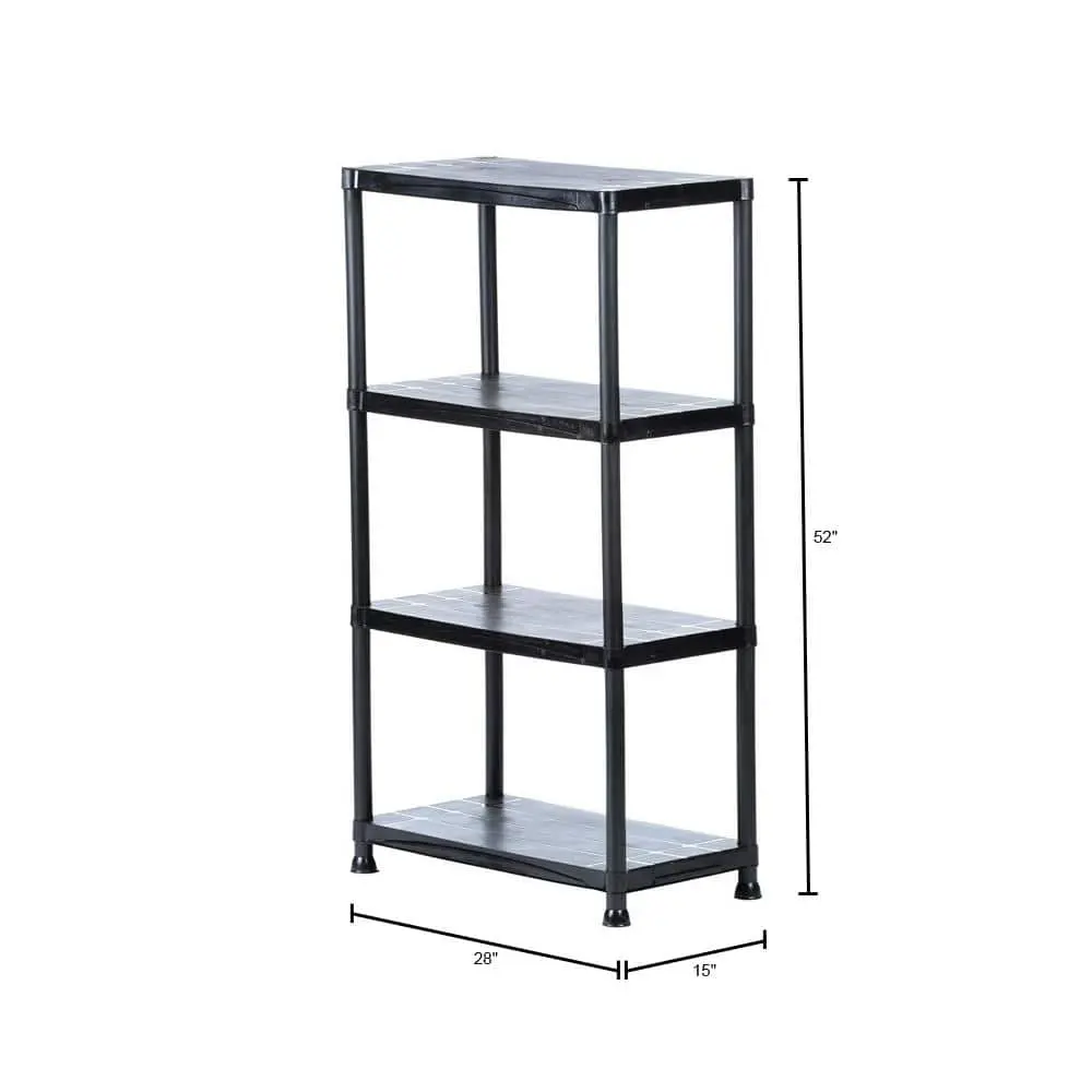 The HDX 4-Tier Easy Assembly Scratch Resistant Plastic Garage Storage Shelving Unit is designed for durability and convenience. With dimensions of 28 in. W x 52 in. H x 15 in. D, this shelving unit offers ample space for organizing your garage or utility room. Made from scratch-resistant plastic, it can handle heavy-duty use while maintaining its appearance. The unit features 4 adjustable shelves to customize your storage needs, supporting up to 50 lbs per shelf. Easy assembly requires no tools, making it quick and hassle-free to set up. Its compact design is perfect for smaller spaces while providing efficient storage