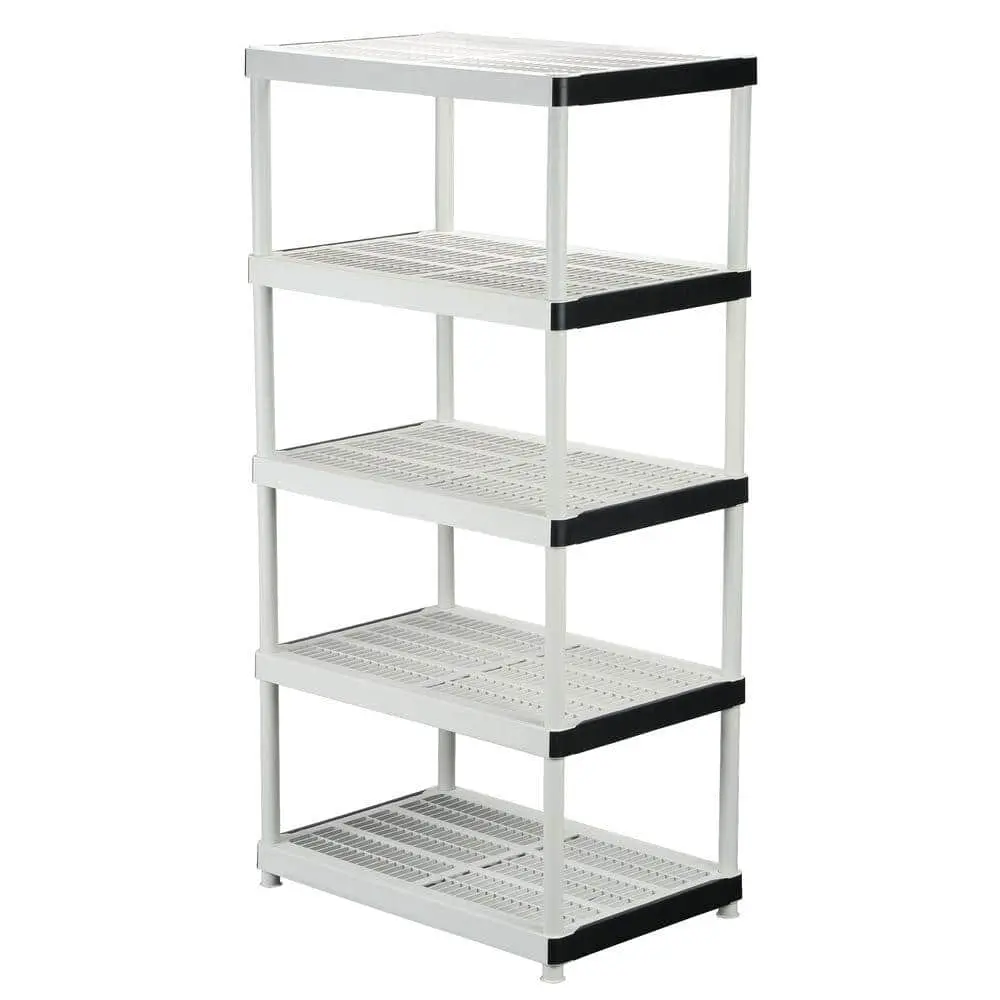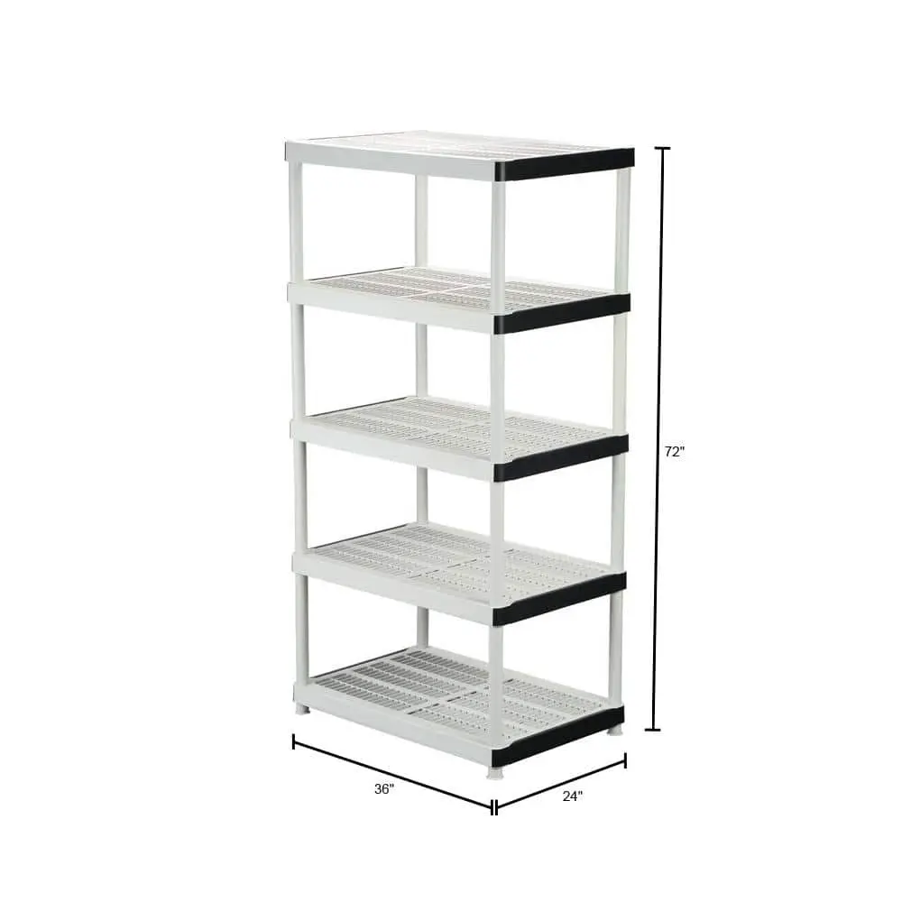 The HDX 5-Tier Easy Assembly Multi-purpose Plastic Garage Storage Shelving Unit offers a durable and lightweight solution for your storage needs. Made with durable plastic construction, it ensures long-lasting performance while being easy to move. The unit features 5 adjustable shelves that provide flexible storage options for a variety of items. Easy assembly allows for a hassle-free setup with no tools required, making it perfect for quick organization. With the ability to support up to 200 lbs. per shelf, it securely holds heavier items. Measuring 36 in. W x 72 in. H x 24 in. D, this shelving unit maximizes your space efficiently, making it ideal for garages, kitchens, basements, or any other area in need of organization. The neutral gray finish blends seamlessly into any environment.