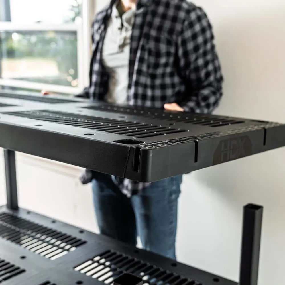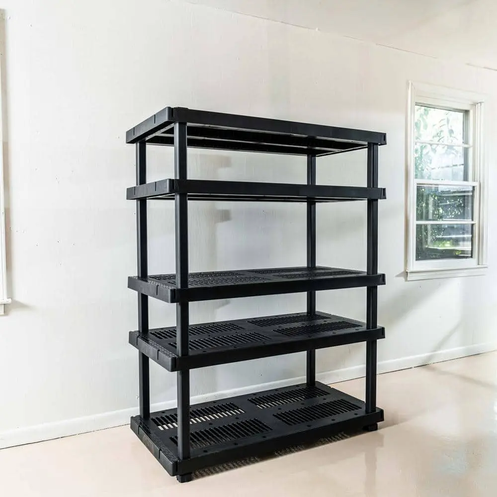 The HDX 5-Tier Plastic Adjustable Garage Storage Shelving Unit is the perfect storage solution for organizing your space. Crafted with durable plastic construction, it offers both strength and lightweight convenience for long-term use. Featuring 5 adjustable shelves, it allows for customizable storage to accommodate items of various sizes. The shelving unit can hold up to 250 lbs. per shelf, making it suitable for heavy-duty storage needs. Its easy assembly ensures a quick setup without any tools. With dimensions of 48 in. W x 75 in. H x 24 in. D, it provides ample space while still fitting into smaller areas. The sleek black finish gives it a modern touch that blends well with any decor.