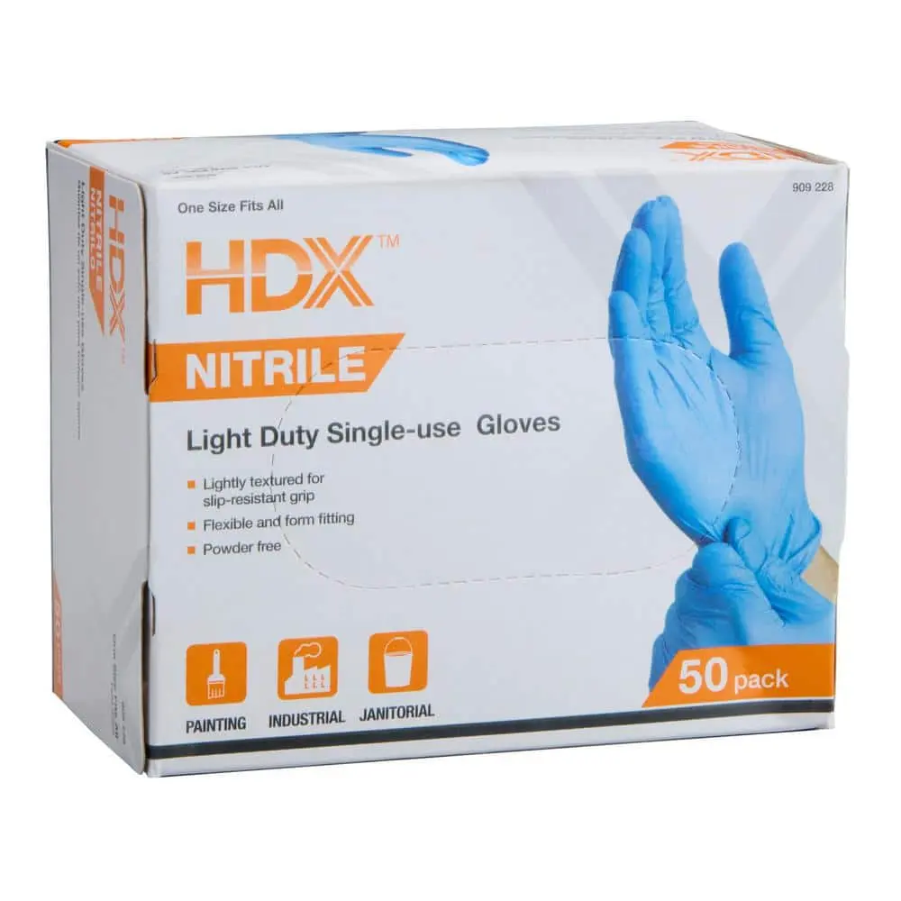 The HDX 50-Count Disposable Nitrile Gloves offer a convenient 50-count box, perfect for moderate use and easy storage. Made from durable nitrile material, these gloves provide excellent resistance to punctures and chemicals. Their disposable design makes them ideal for single-use tasks, while the powder-free formula minimizes the risk of skin irritation. The textured surface ensures a secure, non-slip grip, making them reliable for various applications