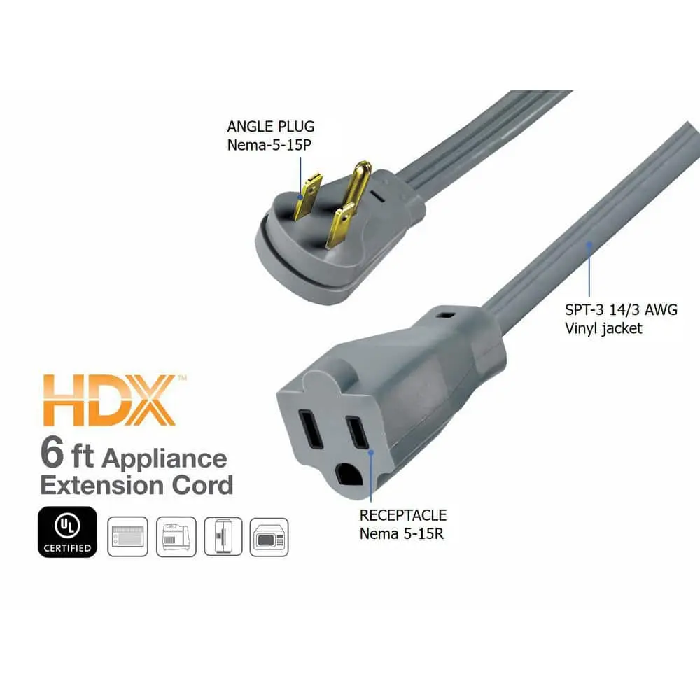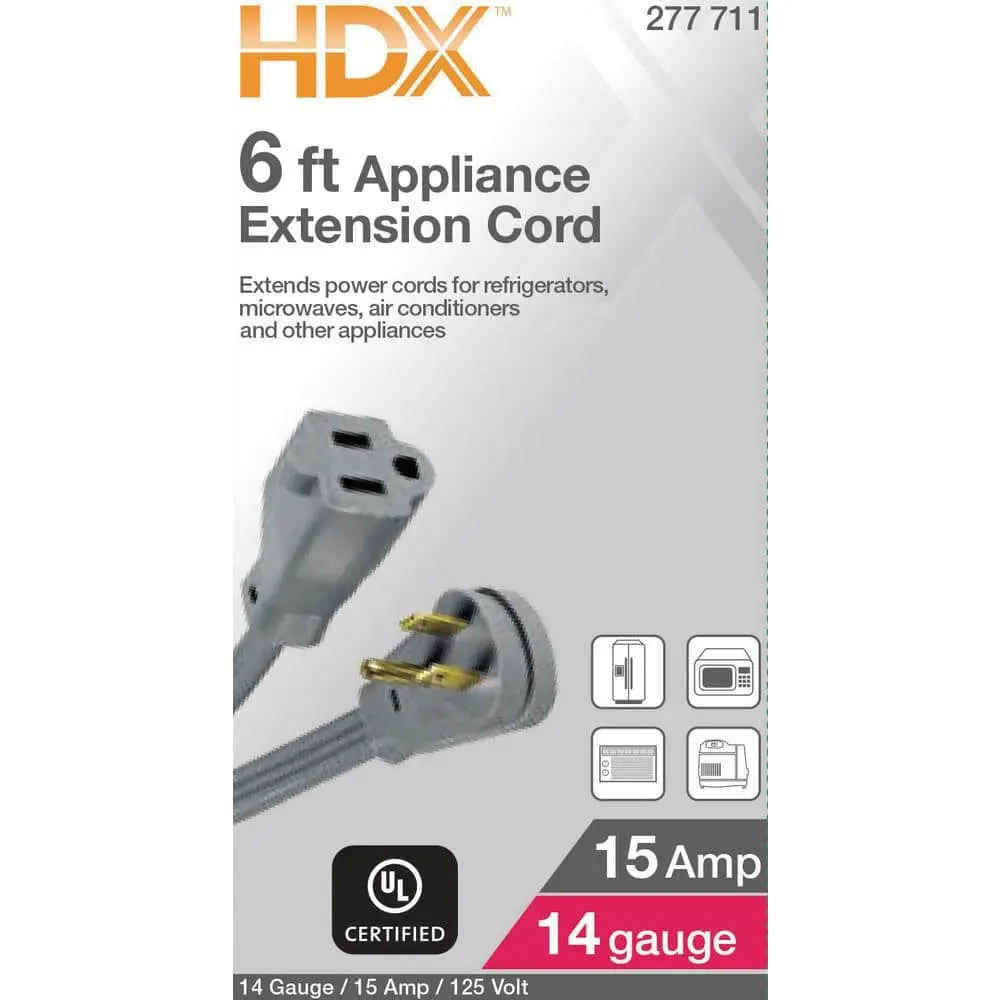 The HDX 6 ft. 15 Amp Air Conditioner/Appliance Extension Cord is designed for use with medium-duty appliances and is UL certified. It extends the power cord for use with air conditioners, refrigerators, and other appliances. The right-angle plug is molded onto the vinyl cord for added strength and helps save space in tight wall applications.