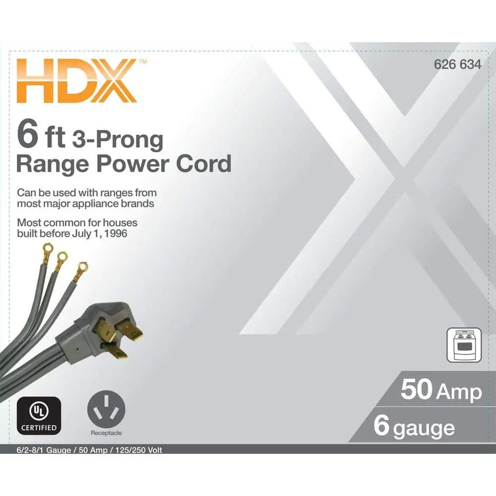 The HDX 6 ft. 50 Amp 3-Prong Range Power Cord is designed for both new installations and replacing the power cord on existing ranges. It’s ideal for connecting to a 50 Amp, 3-prong outlet and is compatible with dryers and other major appliance brands. This cord features a 50 Amp, 125V/250V, 6250-watt capacity with a maximum of 12,500 watts.