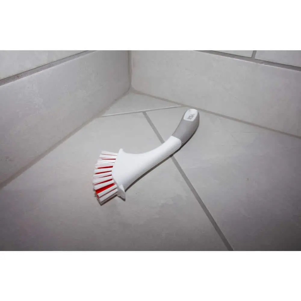 The HDX Tile and Grout Brush is designed for use on all tile and grout surfaces, including floors, bathrooms, countertops, and backsplashes. Its curved tip allows the brush to clean into corners and crevices without scratching, and it can also be used to scrape away tough messes. The extra-durable bristles are treated with an antimicrobial additive to help prevent the growth of odor-causing bacteria.