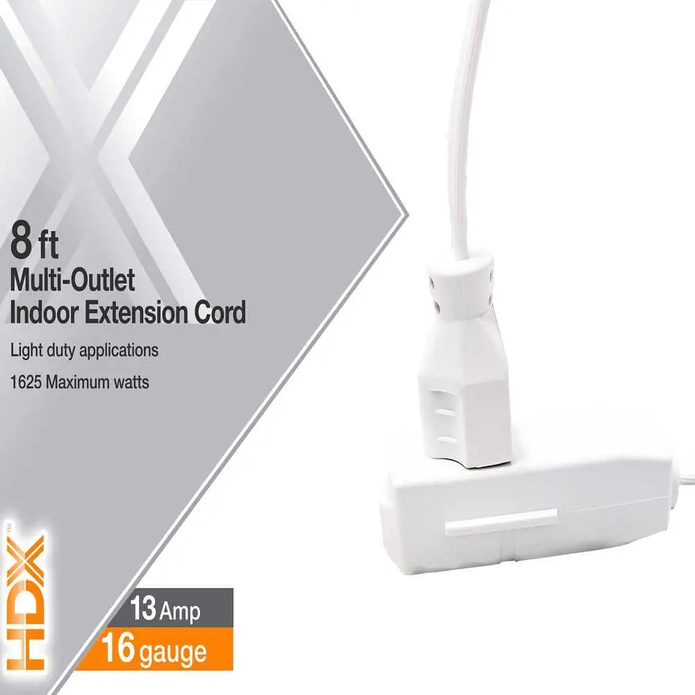 The HDX 8 ft. 16/3 Indoor Multi-Outlet Extension Cord is perfect for home office use or any indoor living space. This medium-length cord provides a convenient solution for powering indoor holiday lights, small appliances, and more. Featuring 3 grounded outlets and a molded 3-prong banana plug, it offers a 13 Amp, 125-Volt, and 1,625-Watt electrical capacity.