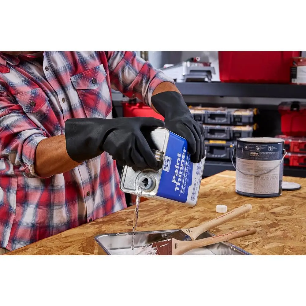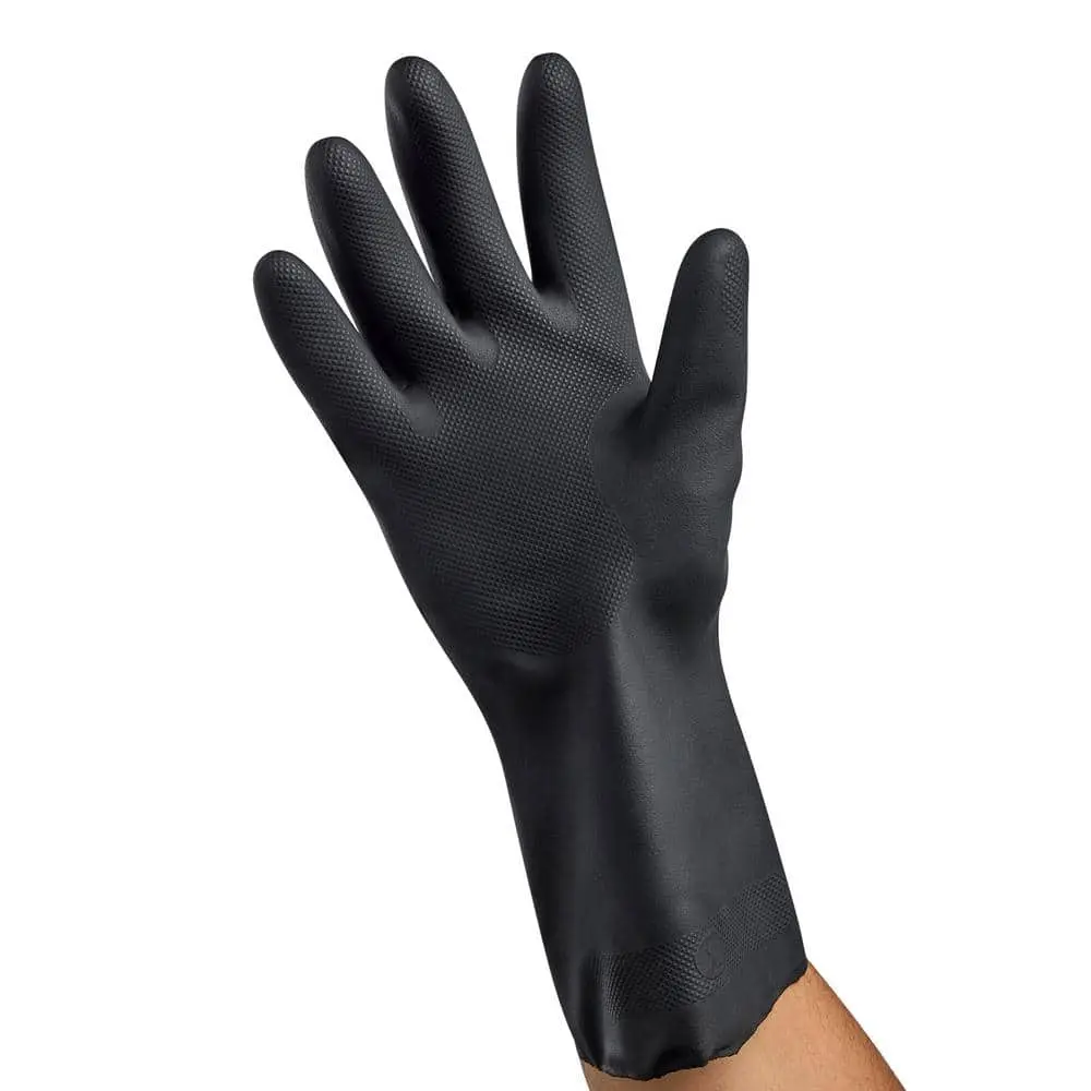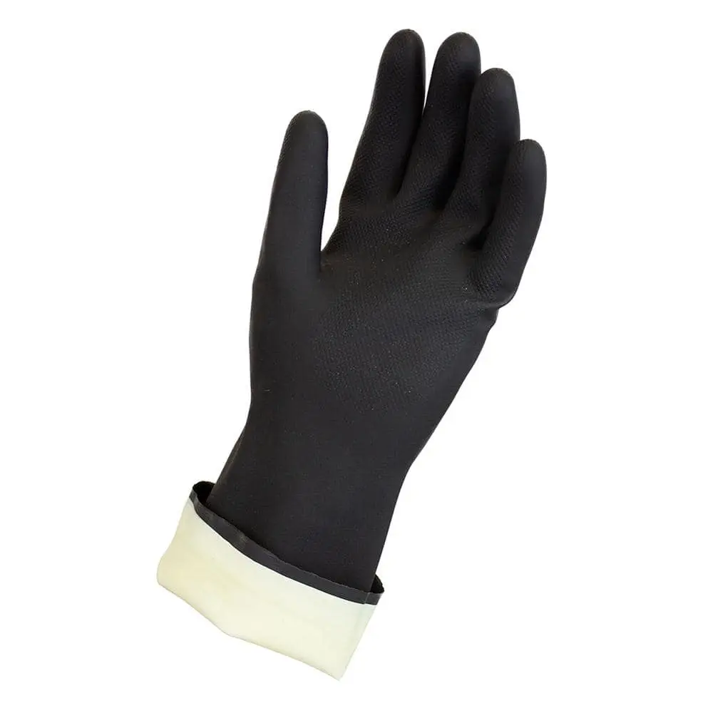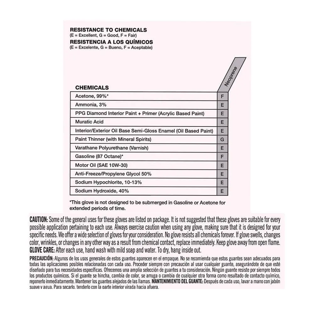 Our Reusable Long-Cuff Black Neoprene Gloves are designed for handling chemicals (refer to the chart), oils, and harsh cleaners. The embossed palm enhances grip, while the long cuff provides extra protection for the lower forearm. The cotton flocked lining ensures a comfortable fit, and these gloves are easy to clean—simply rinse with water and air dry for reuse.