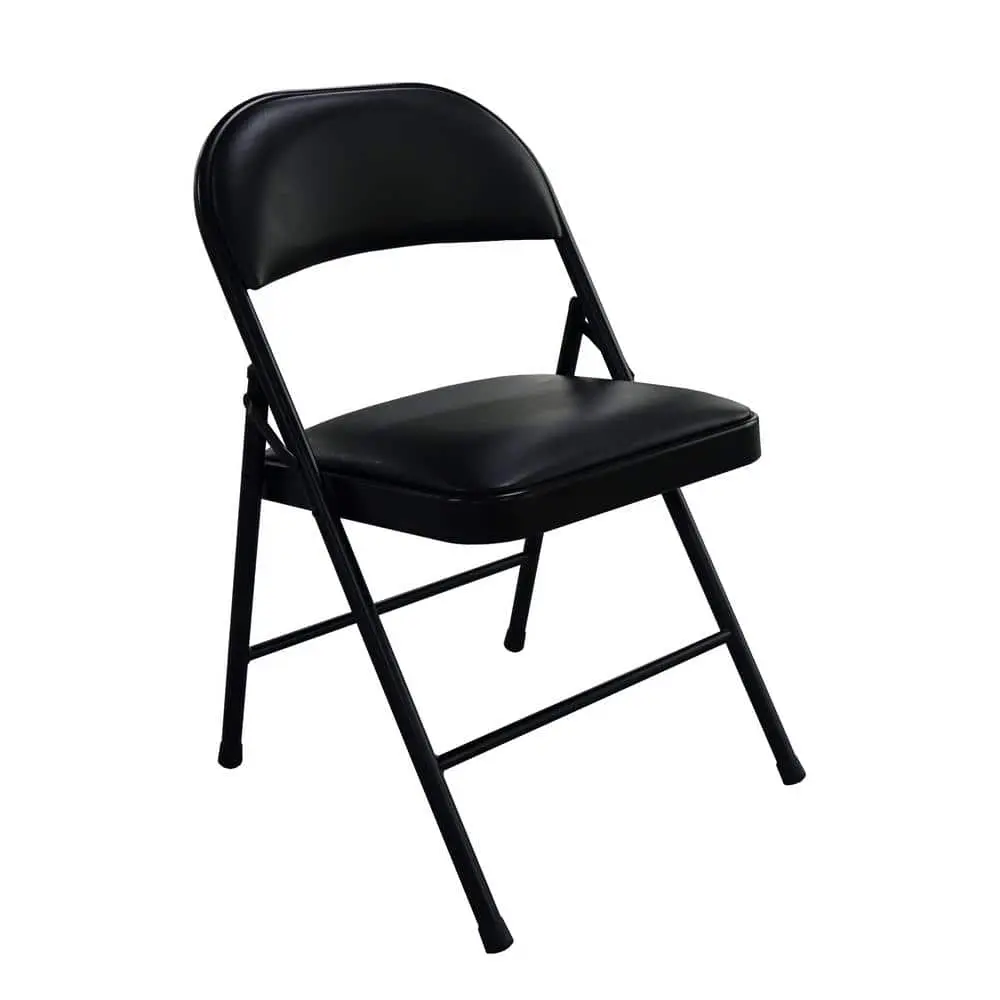 The HDX Black Vinyl Padded Steel Frame Folding Chair offers a sturdy and reliable seating solution for various settings. Built with a durable steel frame, it provides strong support while the black vinyl padding ensures comfort and easy maintenance. Its foldable design allows for quick storage and portability, making it perfect for both everyday use and events. With a scratch-resistant finish, this chair is designed for long-lasting durability, making it a versatile choice for home, office, or gatherings