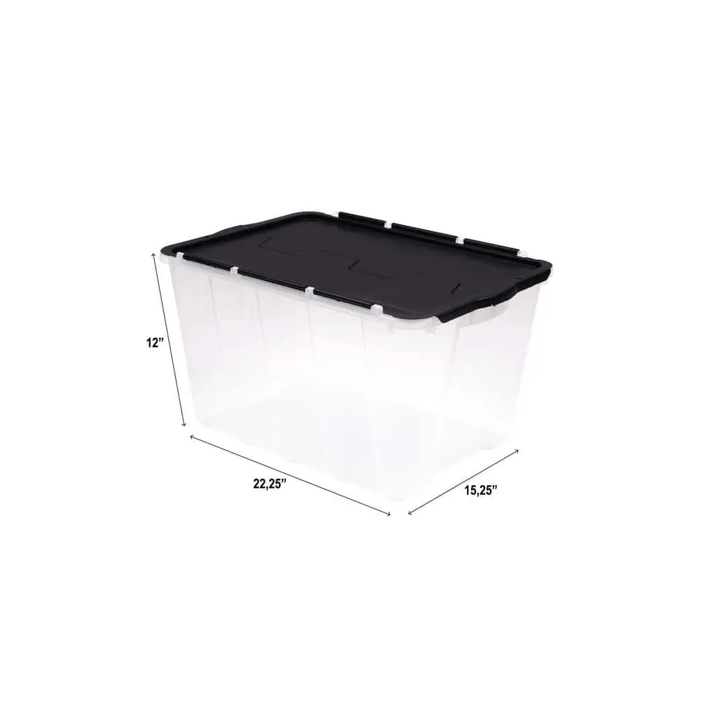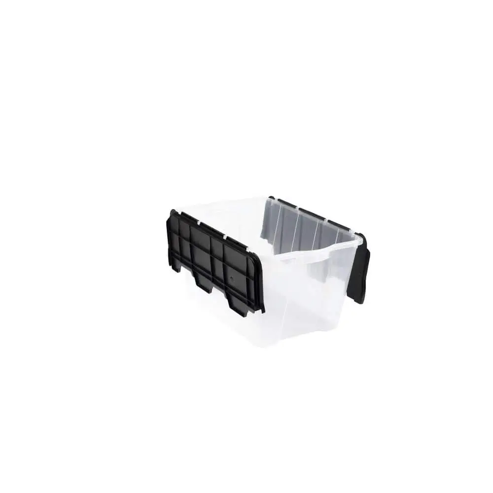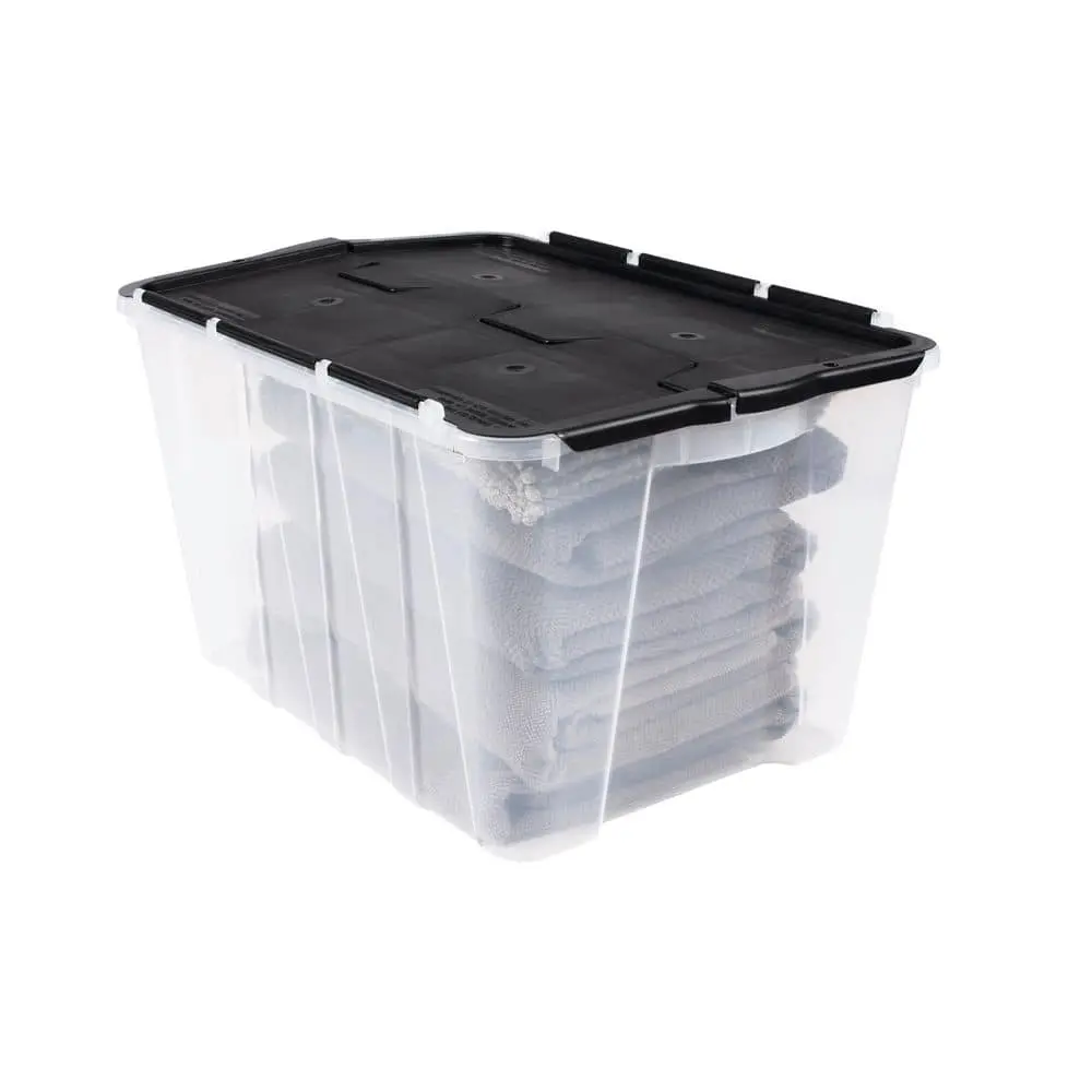 The HDX Clear 12 Gal. Flip Top Storage Tote offers a durable and transparent plastic design, allowing for easy identification of stored items. Its flip-top lid ensures secure closure while providing quick and convenient access to your belongings. Designed for efficient stacking, this tote helps maximize storage space in your home, garage, or office. With its lightweight yet sturdy construction, it is perfect for organizing household essentials, seasonal decorations, or office supplies