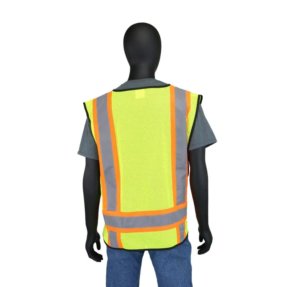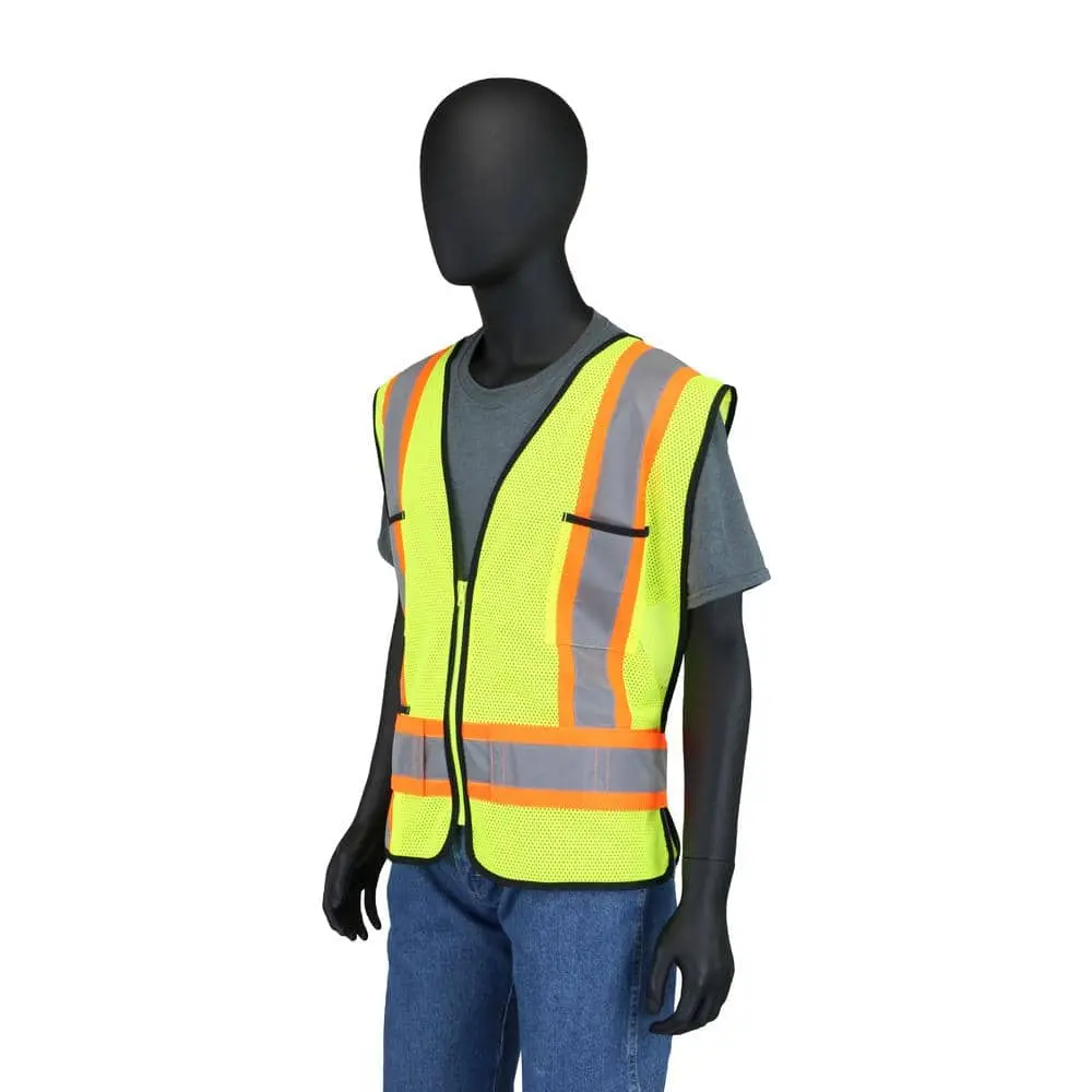 This ANSI Class 2 Hi-Viz Yellow mesh vest is designed for superior visibility and comfort. It features 2-tone H-shaped 2-inch silver reflective tape with 0.75-inch contrasting Hi-Viz orange trim for enhanced safety. Crafted from breathable and lightweight mesh fabric, the vest includes adjustable break-away flaps around the waist for a customized fit. A Hi-Viz lime green front zipper ensures a secure closure, and the vest provides ample storage with one interior and one exterior pocket.