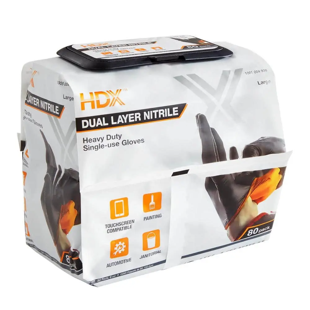 The HDX Pop-N-Go Disposable Heavy Duty Nitrile Gloves (80-Count) offer a larger supply with an 80-count box, perfect for frequent use. Made from heavy-duty nitrile material, these gloves are built for strength and protection. Their disposable design makes them ideal for single-use applications, while the powder-free formula minimizes the risk of irritation. The textured surface ensures a secure and reliable grip, making them suitable for a wide variety of tasks.