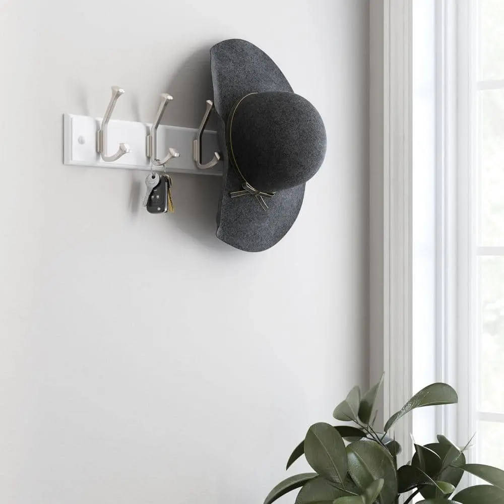 The Home Decorators Collection 18 in. White and Satin Nickel Beveled Square Hook Rack combines both style and functionality. With its 18-inch length, it provides ample space for hanging coats, bags, or towels. The beveled square hooks give a modern touch, while the sleek white and satin nickel finish complements a variety of home decors. Built with durable construction, this hook rack ensures long-lasting use. Perfect for entryways or bathrooms, it enhances any space while offering easy installation with the included hardware